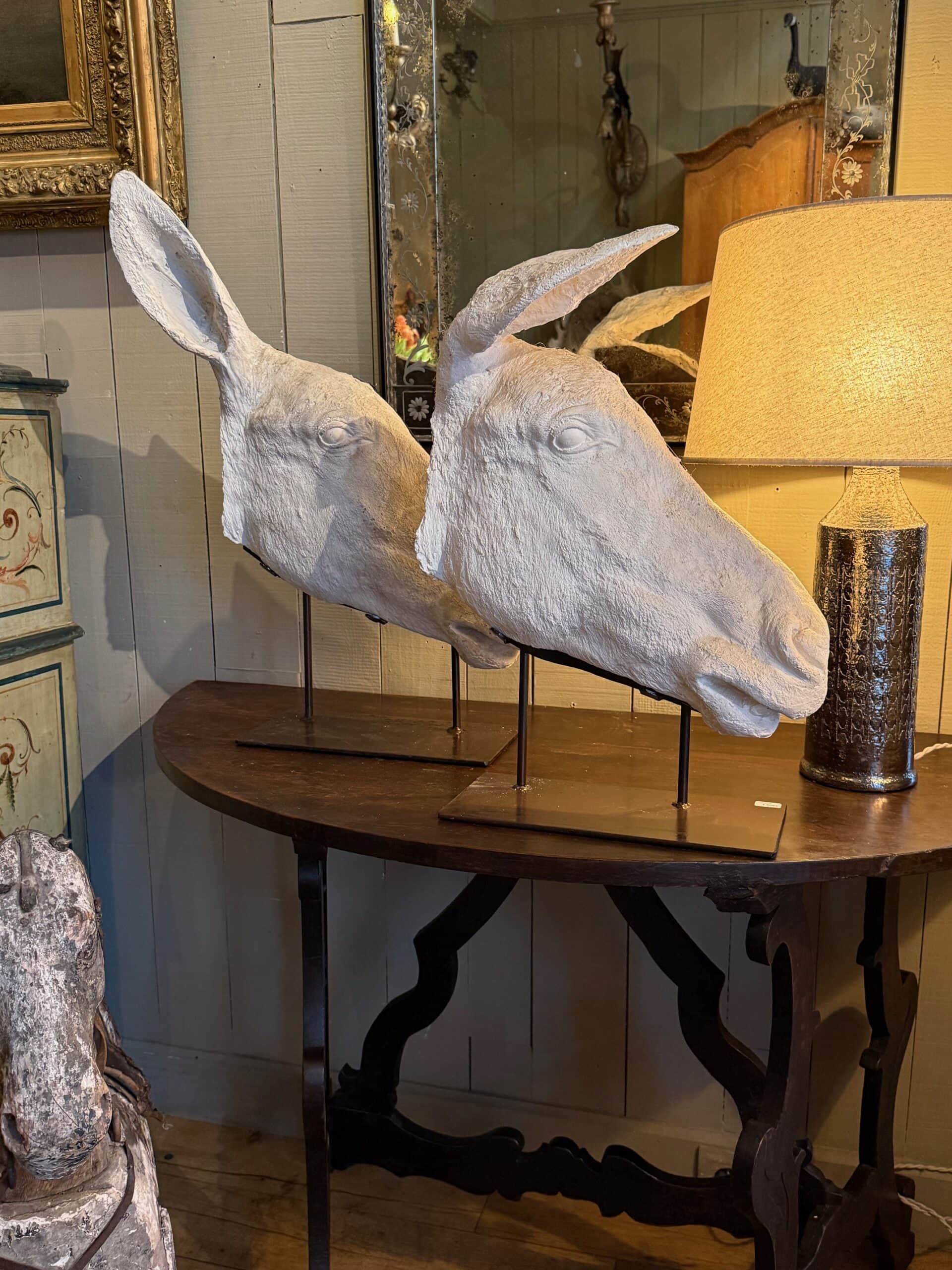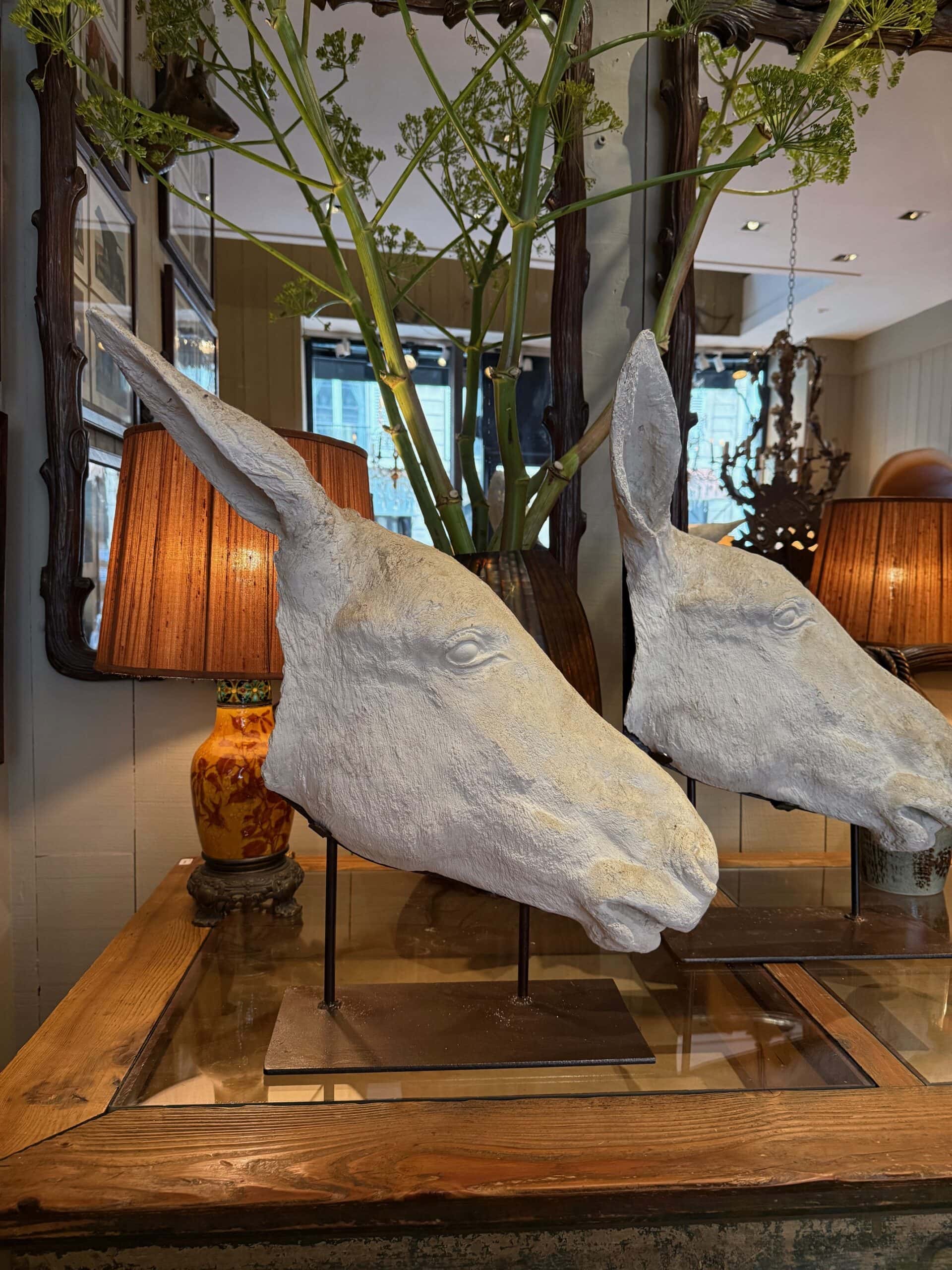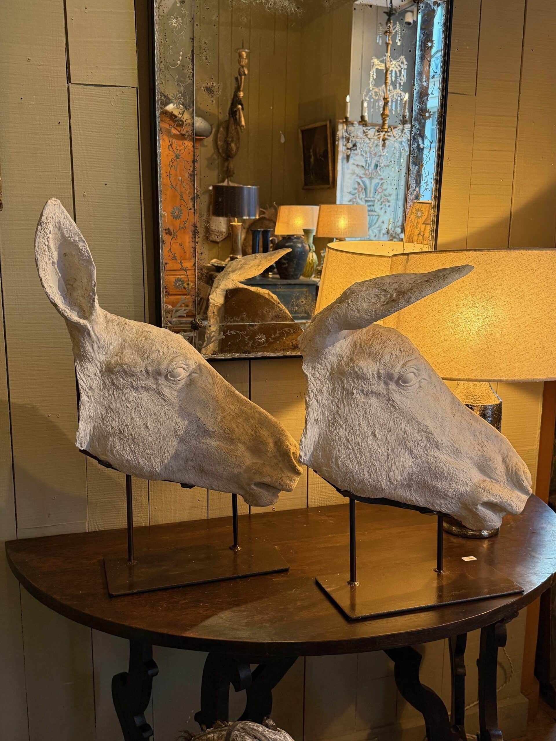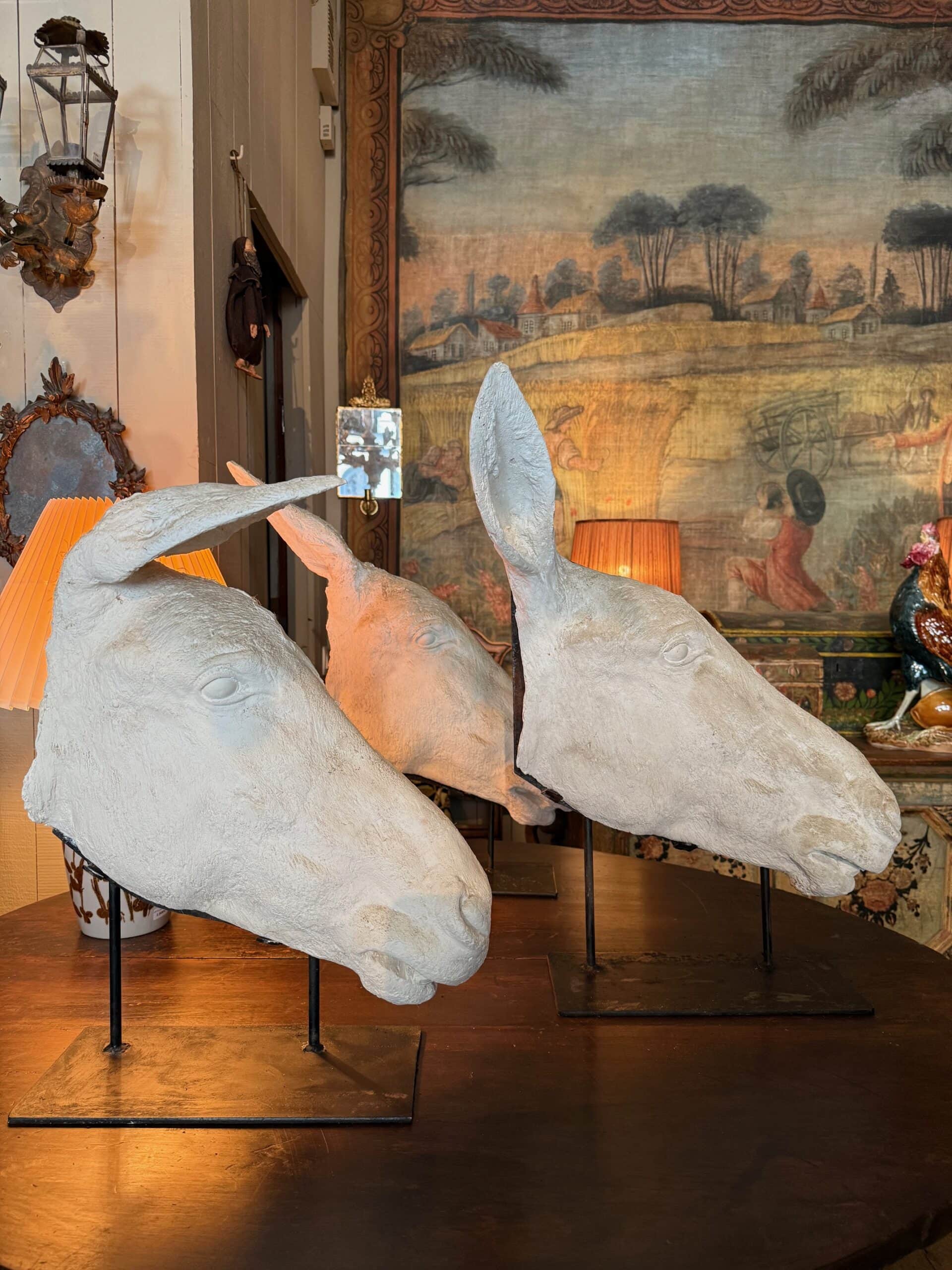 Collection de 3 profils d’Anes en plâtre – sur socles en fer ca.1900