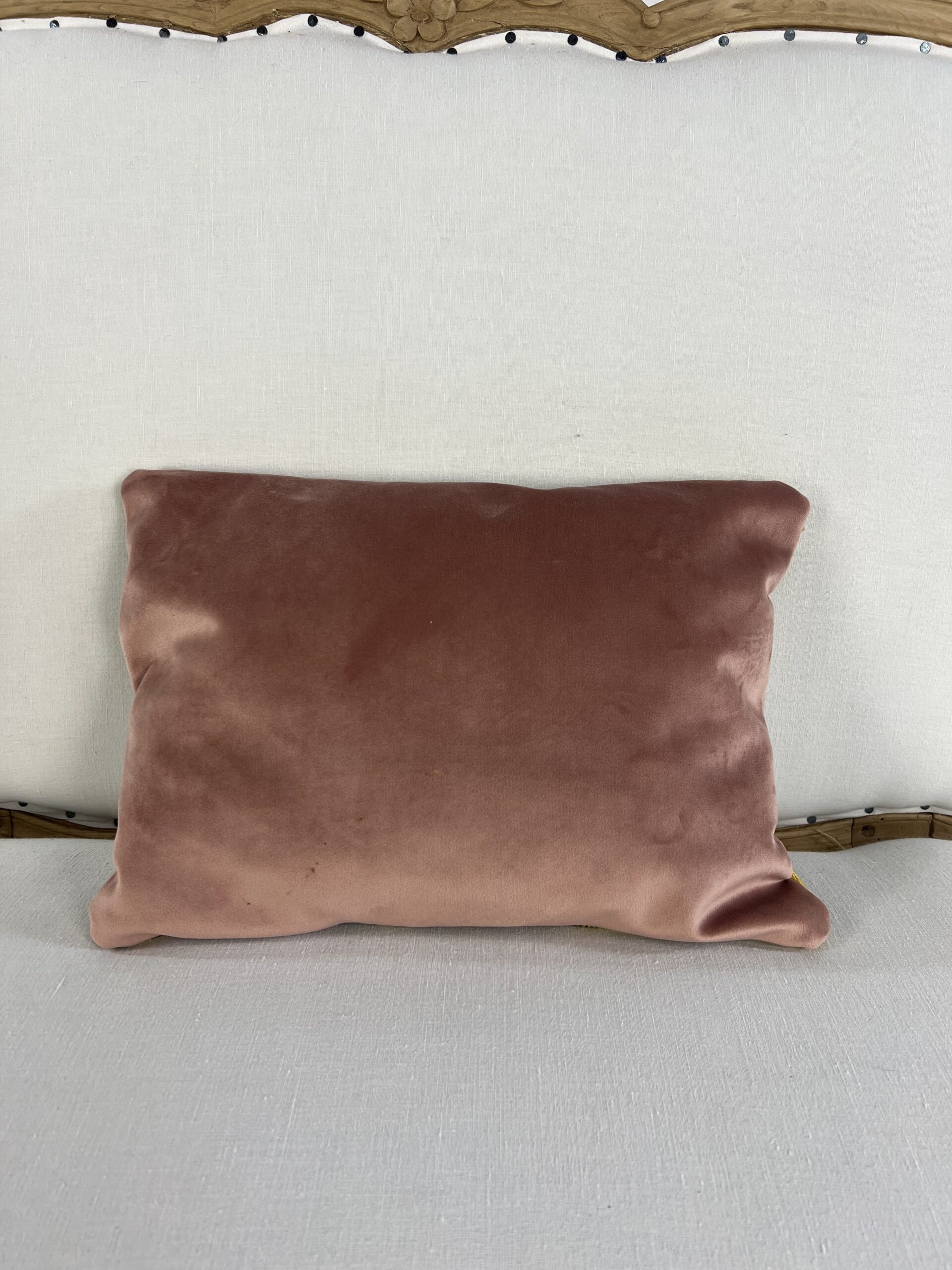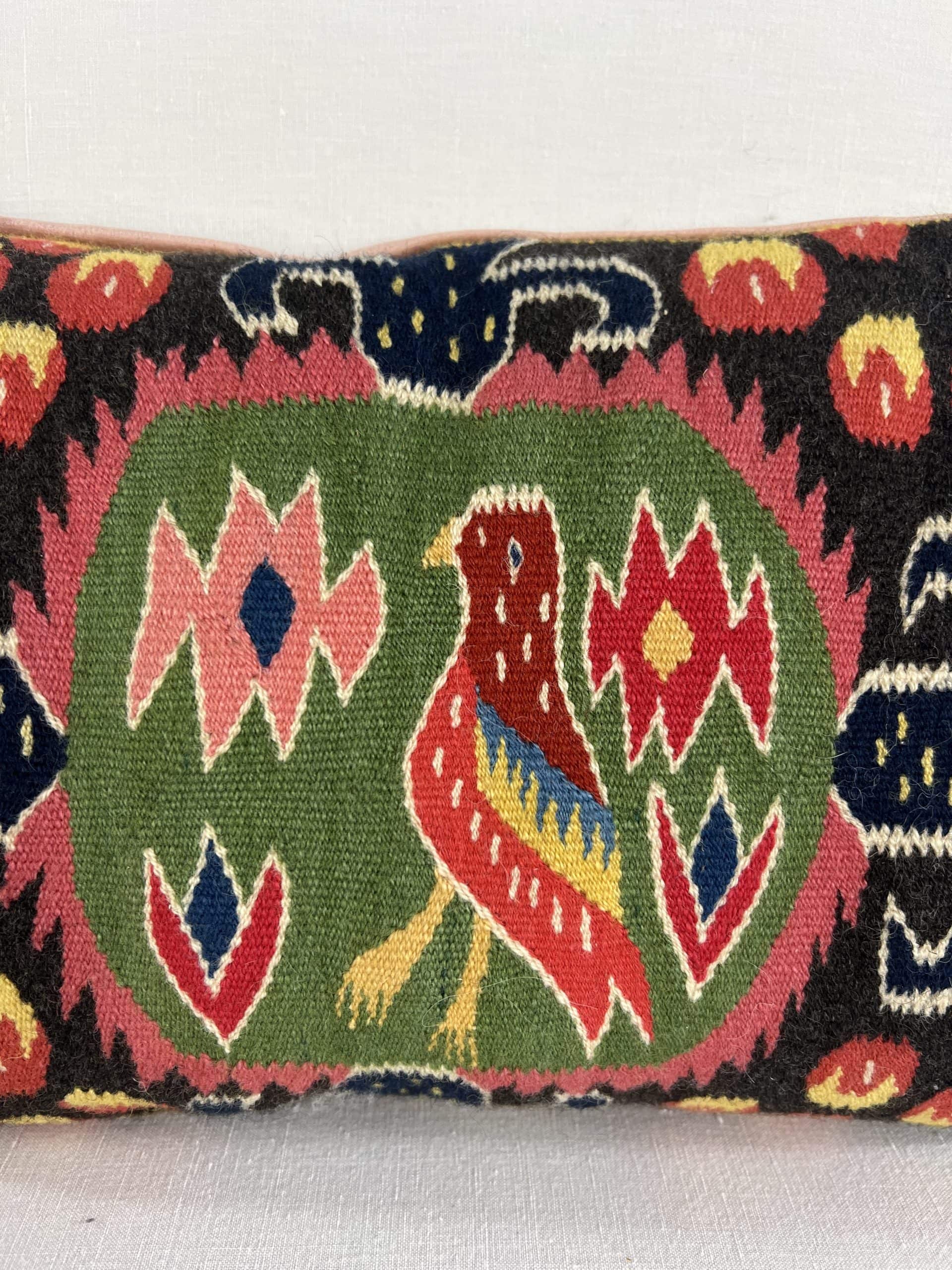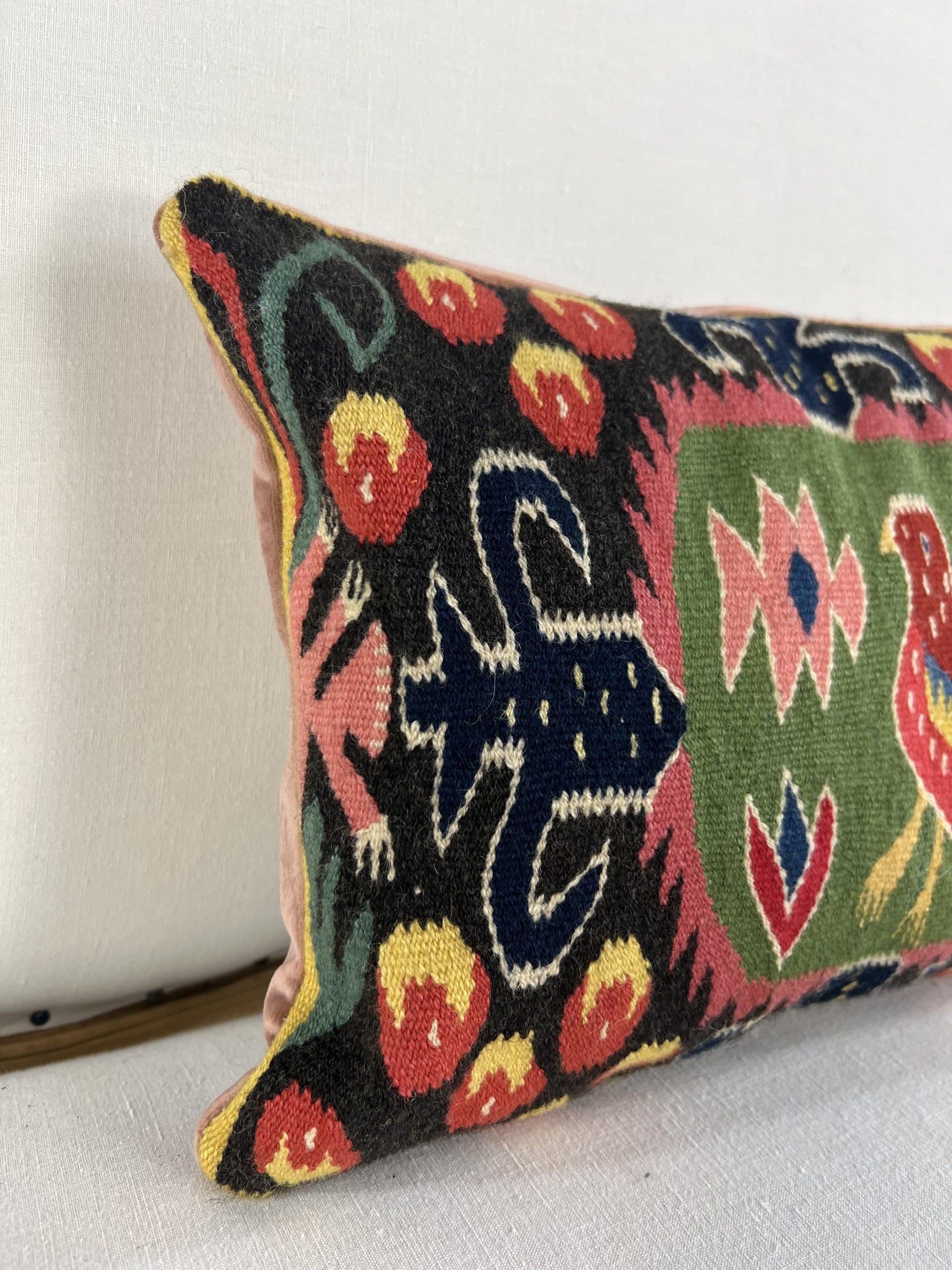 The blush velvet backing is a later addition that brings a soft, elegant contrast. A vivid decorative piece that adds Scandinavian folk character to any sofa or chair.