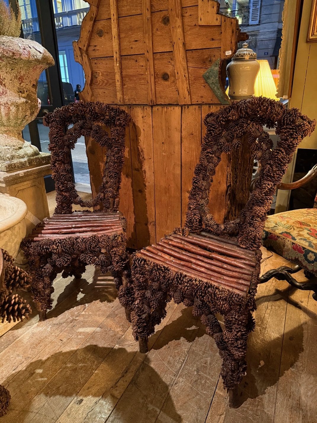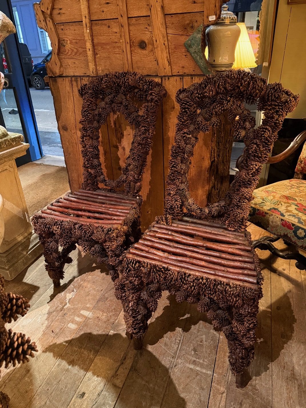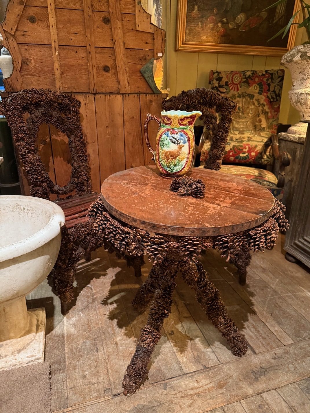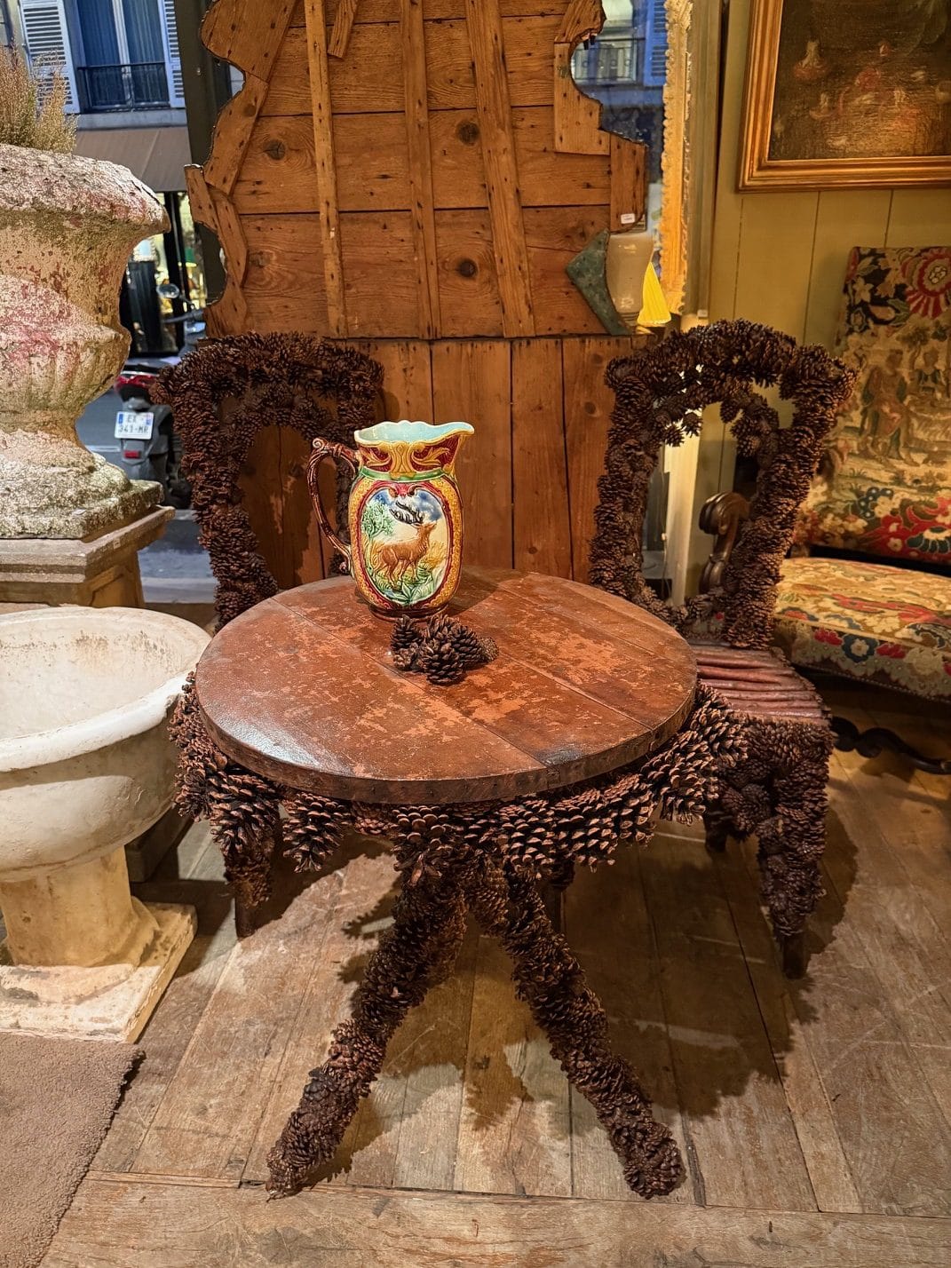 Ensemble 2 chaises+1 table en pommes de pins – Forêt Noire ca.1900