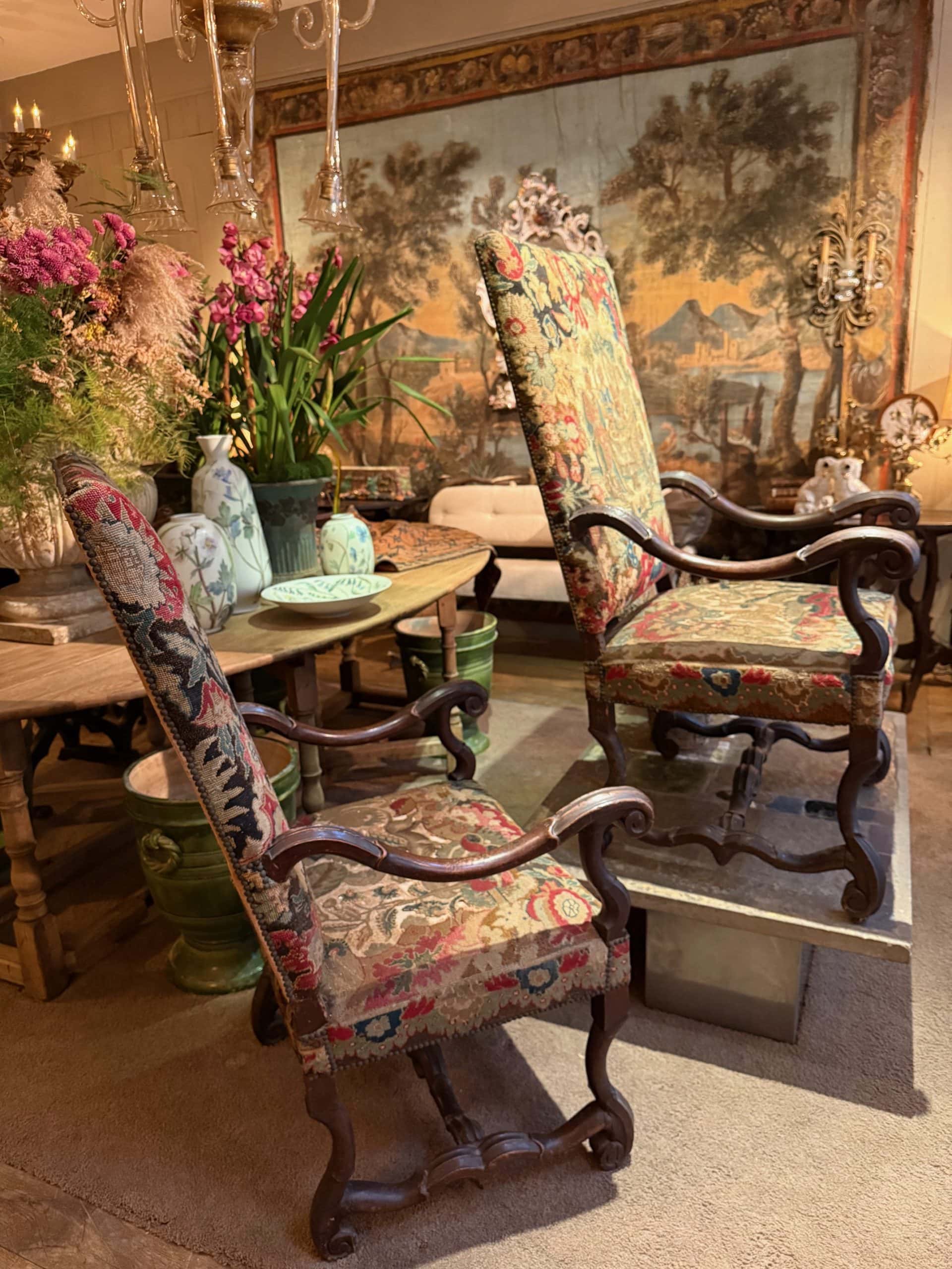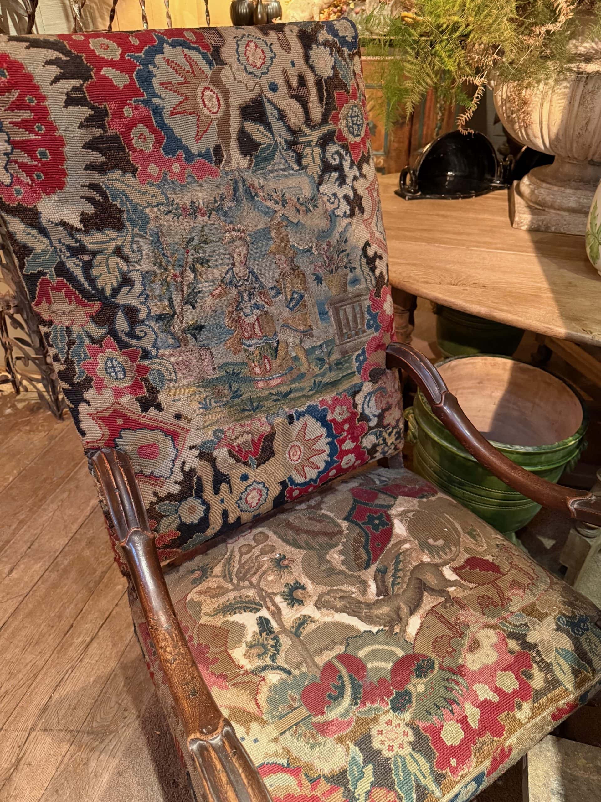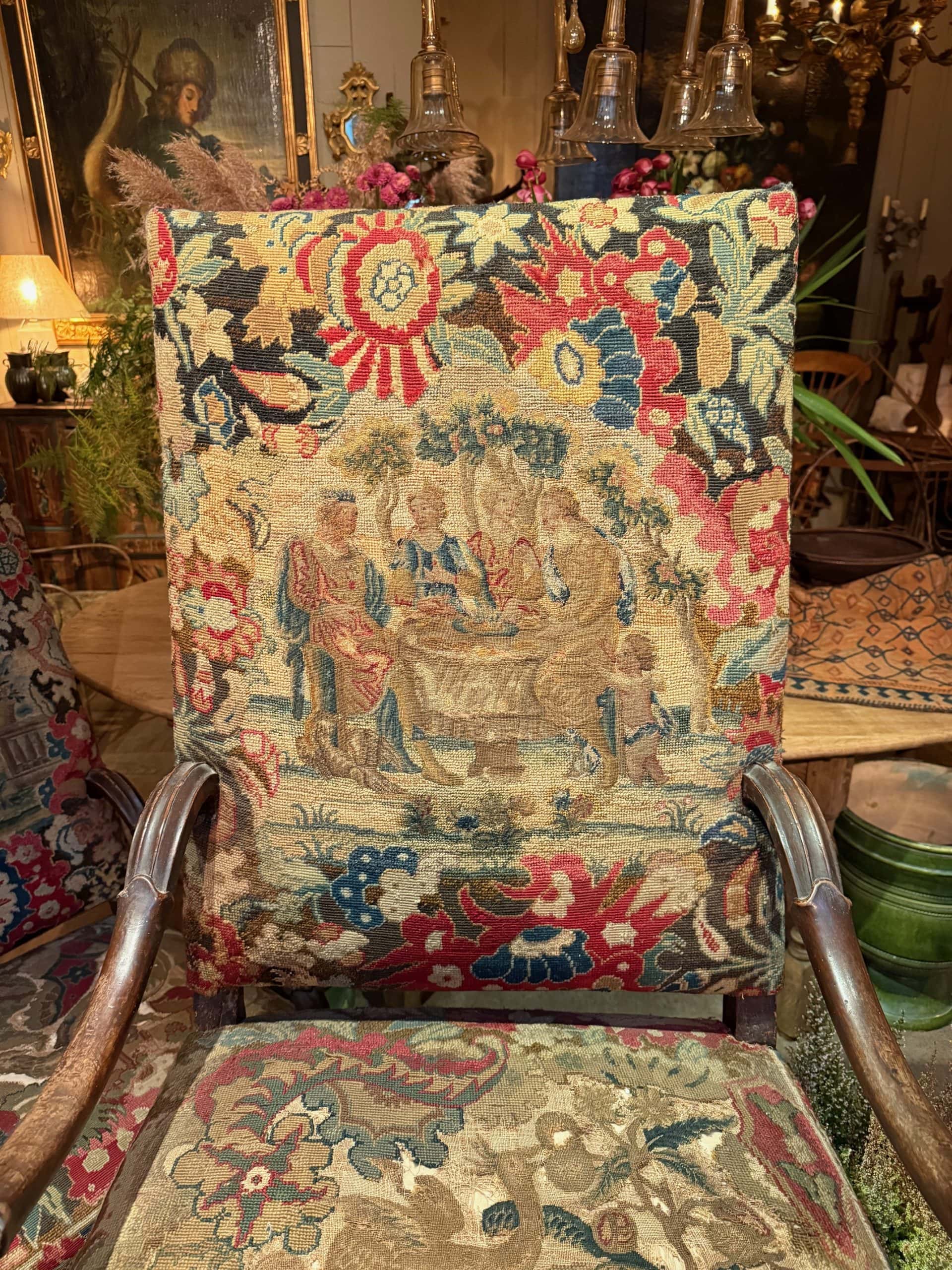 Paire de grands fauteuils XVIIIe en bois sculpté et tapisserie “scènes romantiques” – France