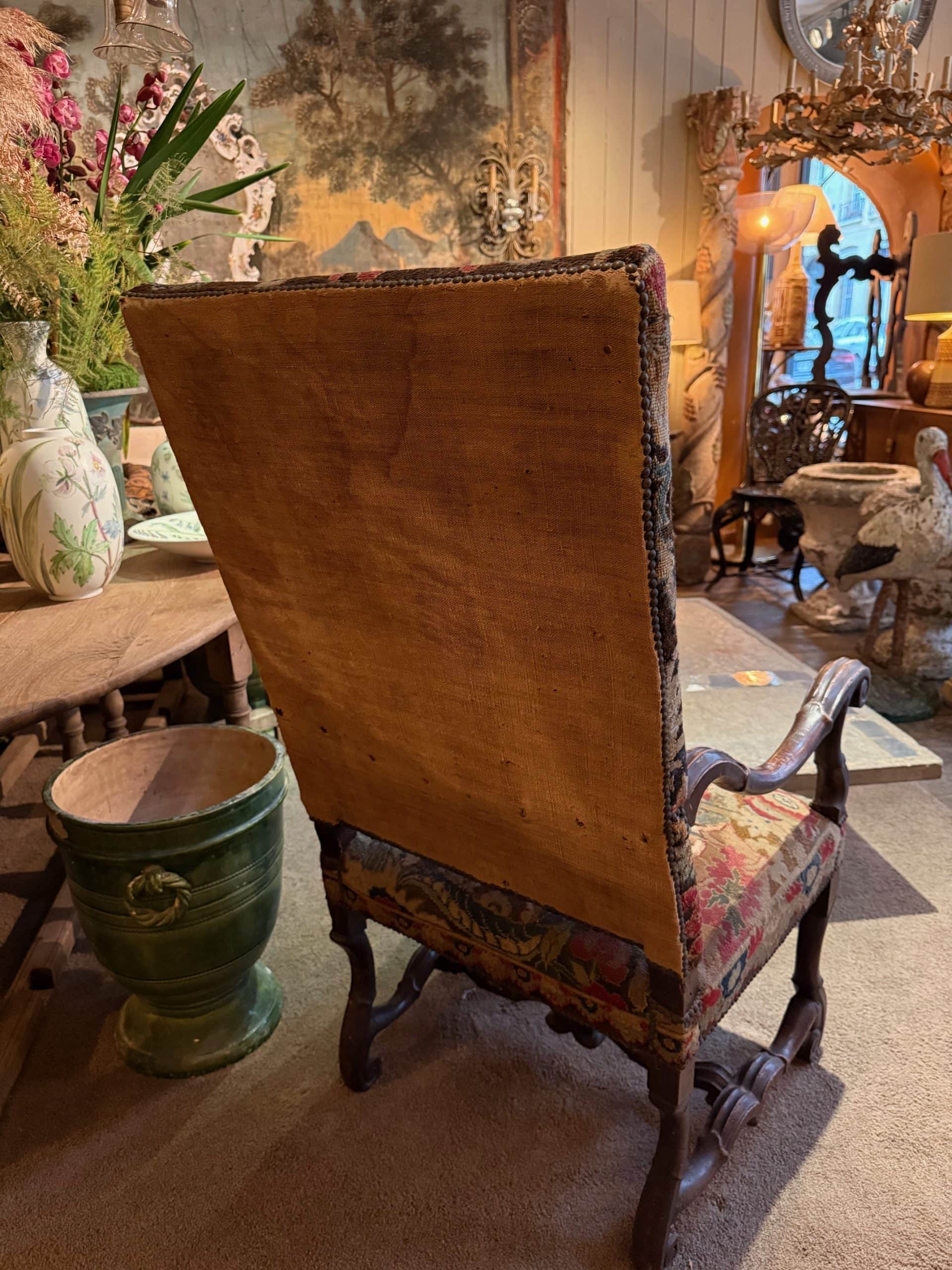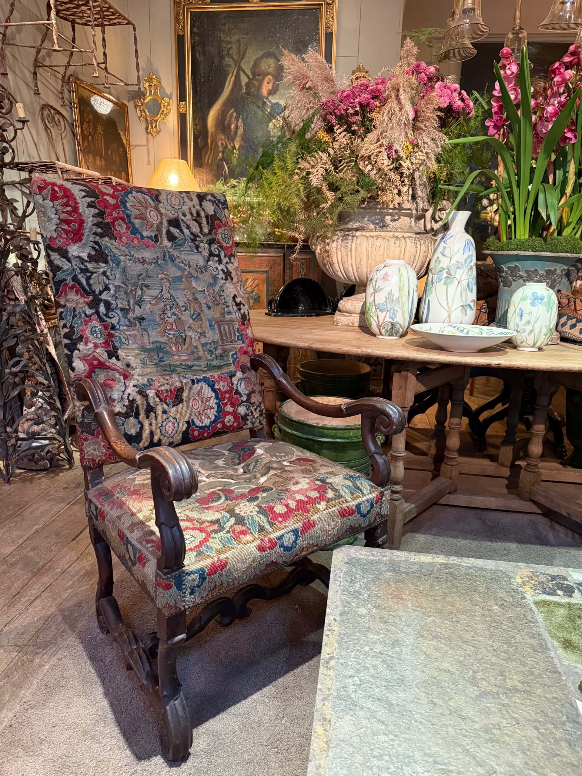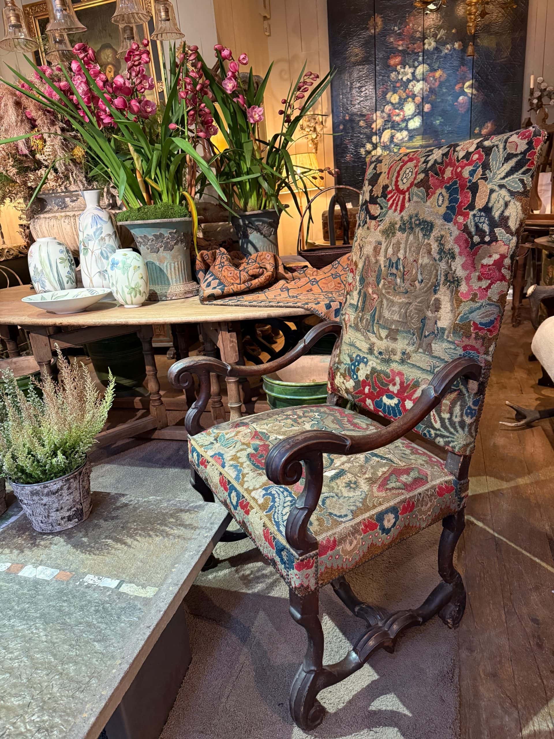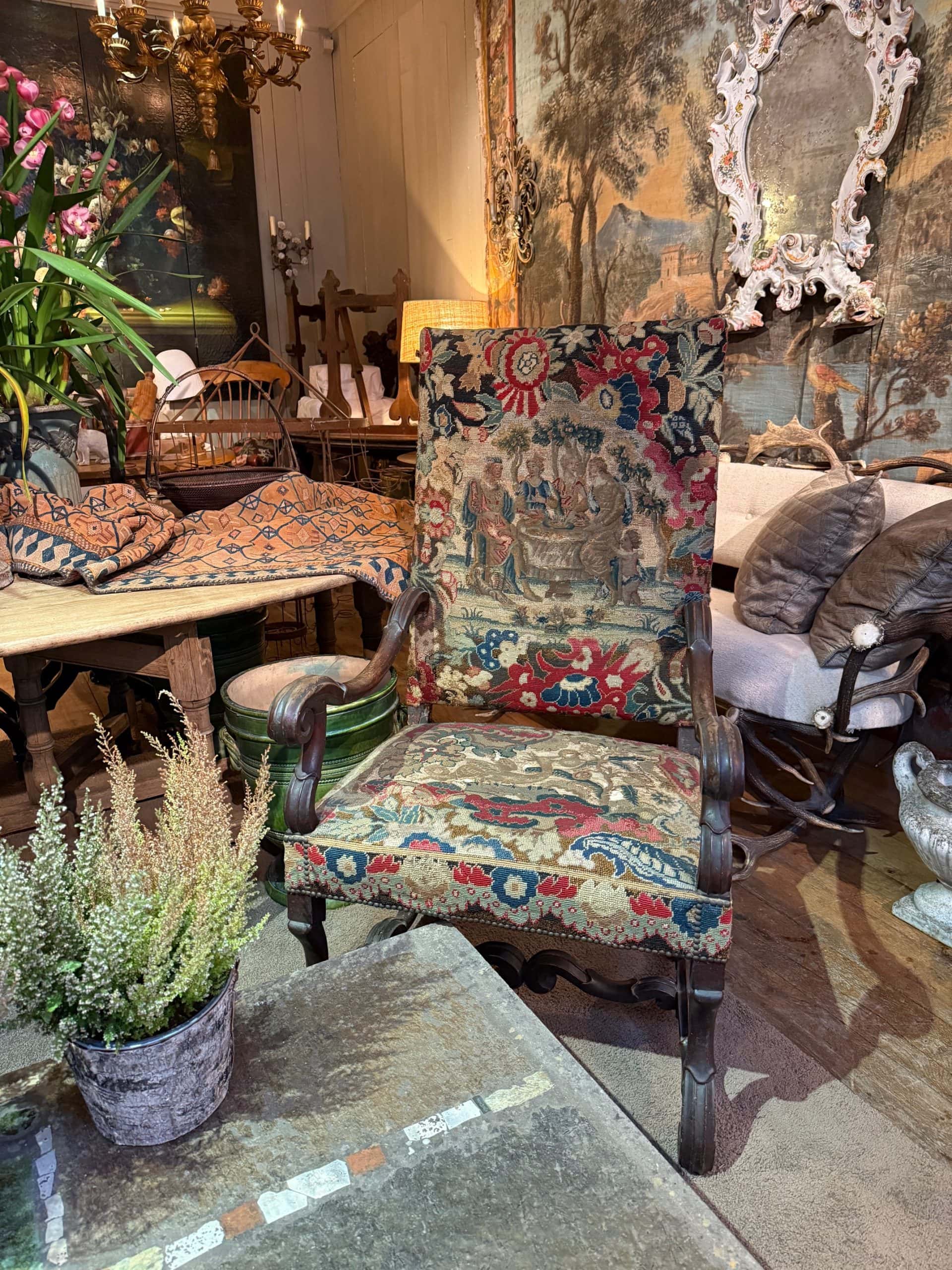 Paire de grands fauteuils XVIIIe en bois sculpté et tapisserie “scènes romantiques” – France