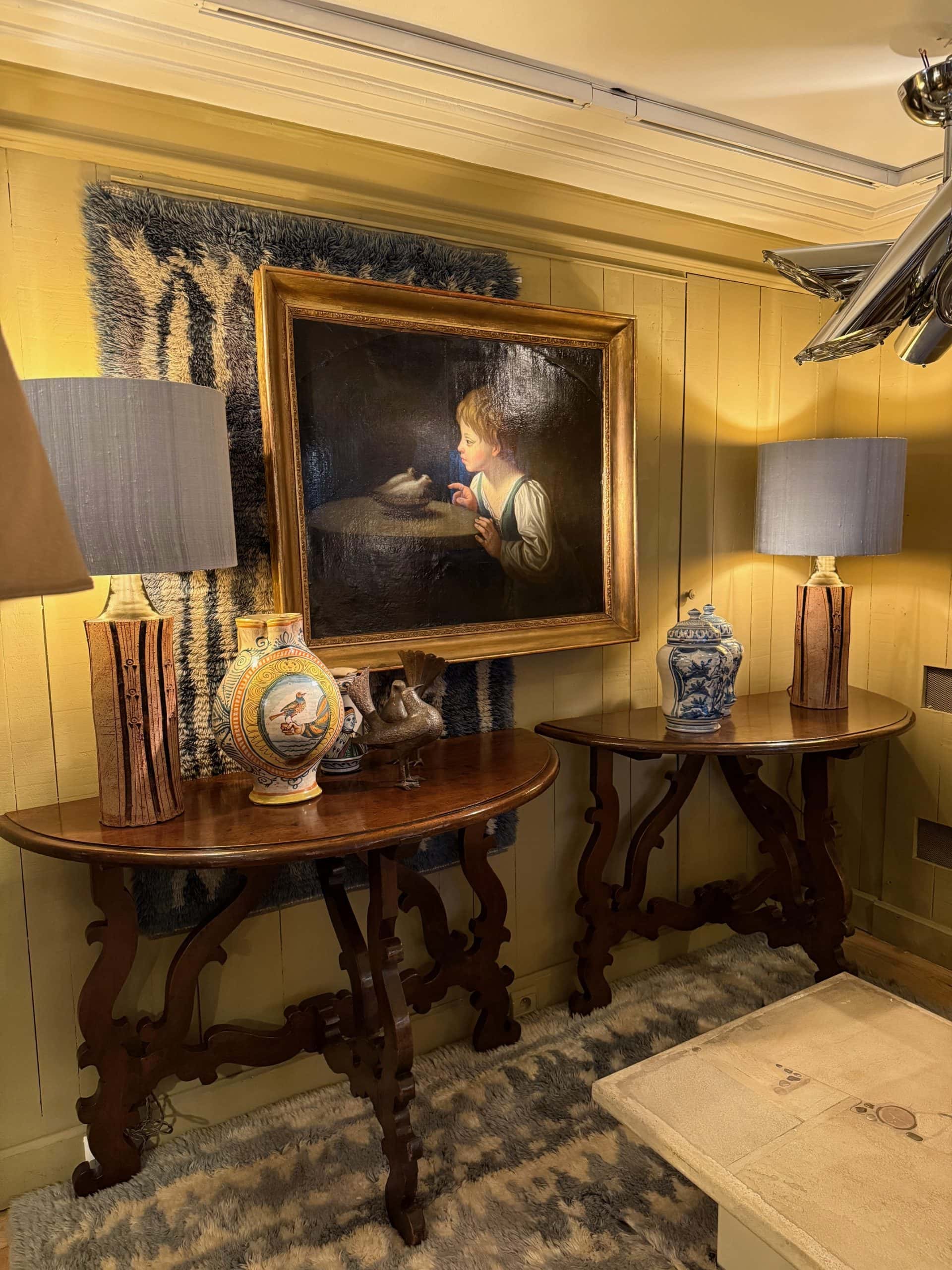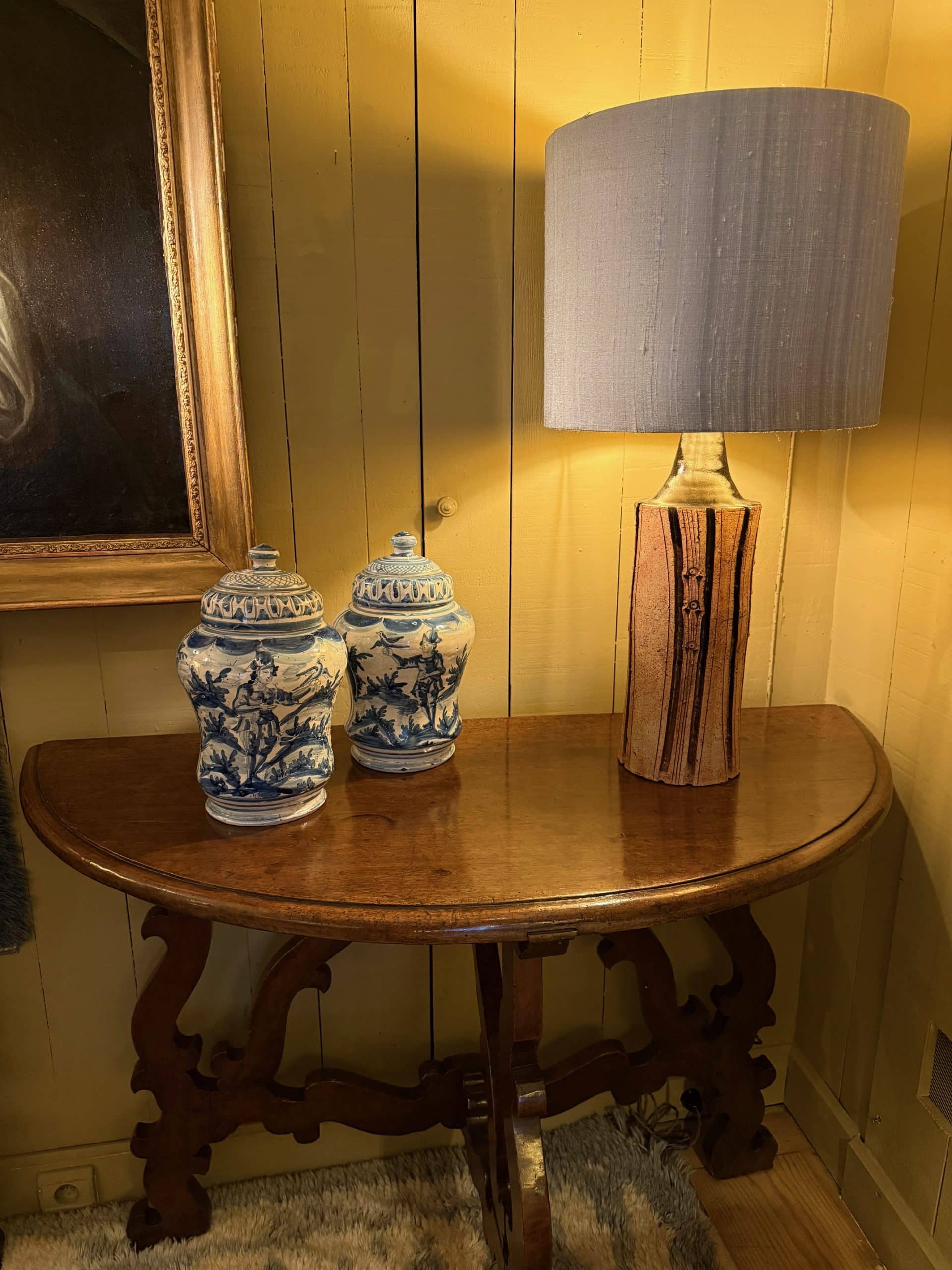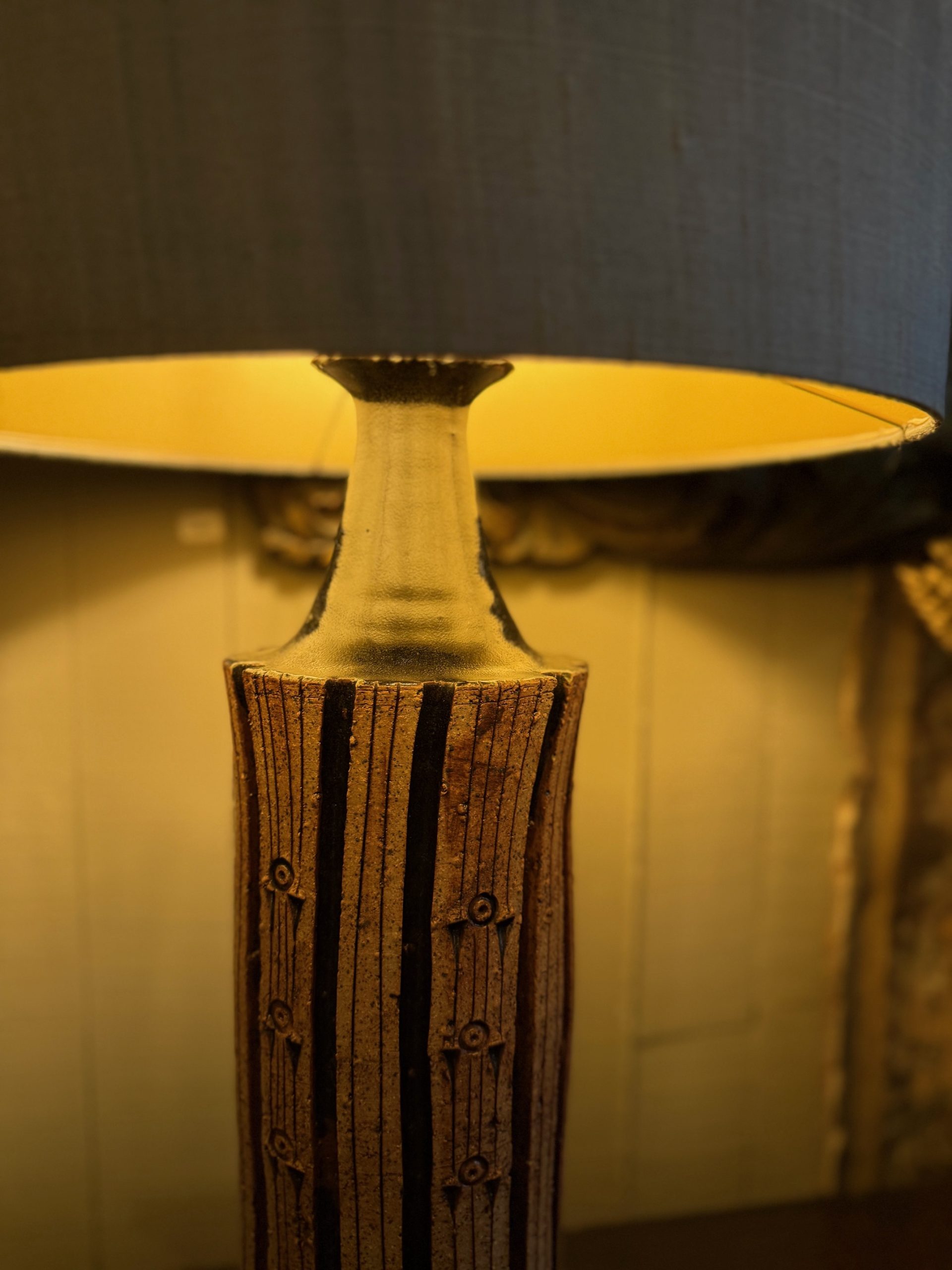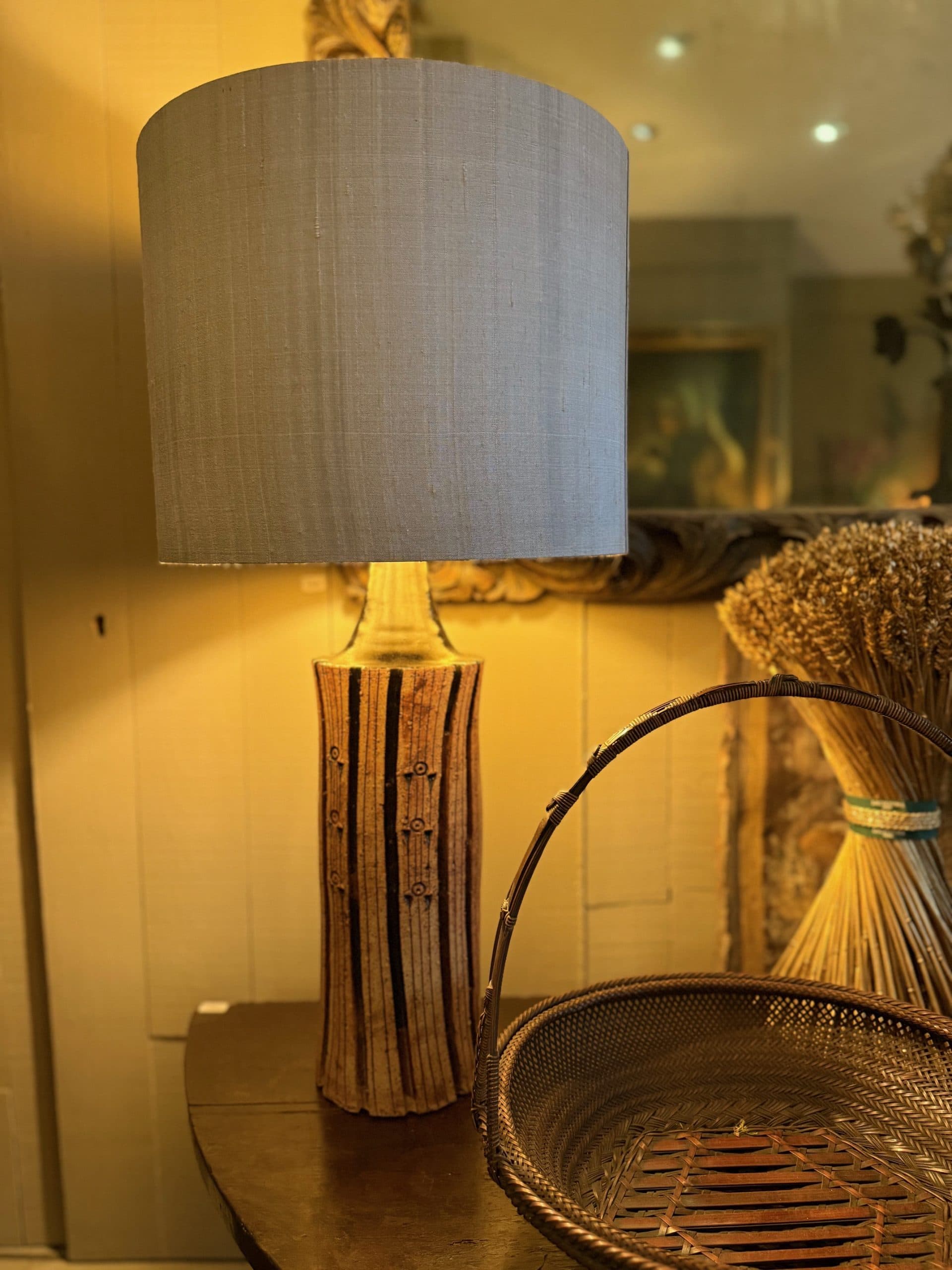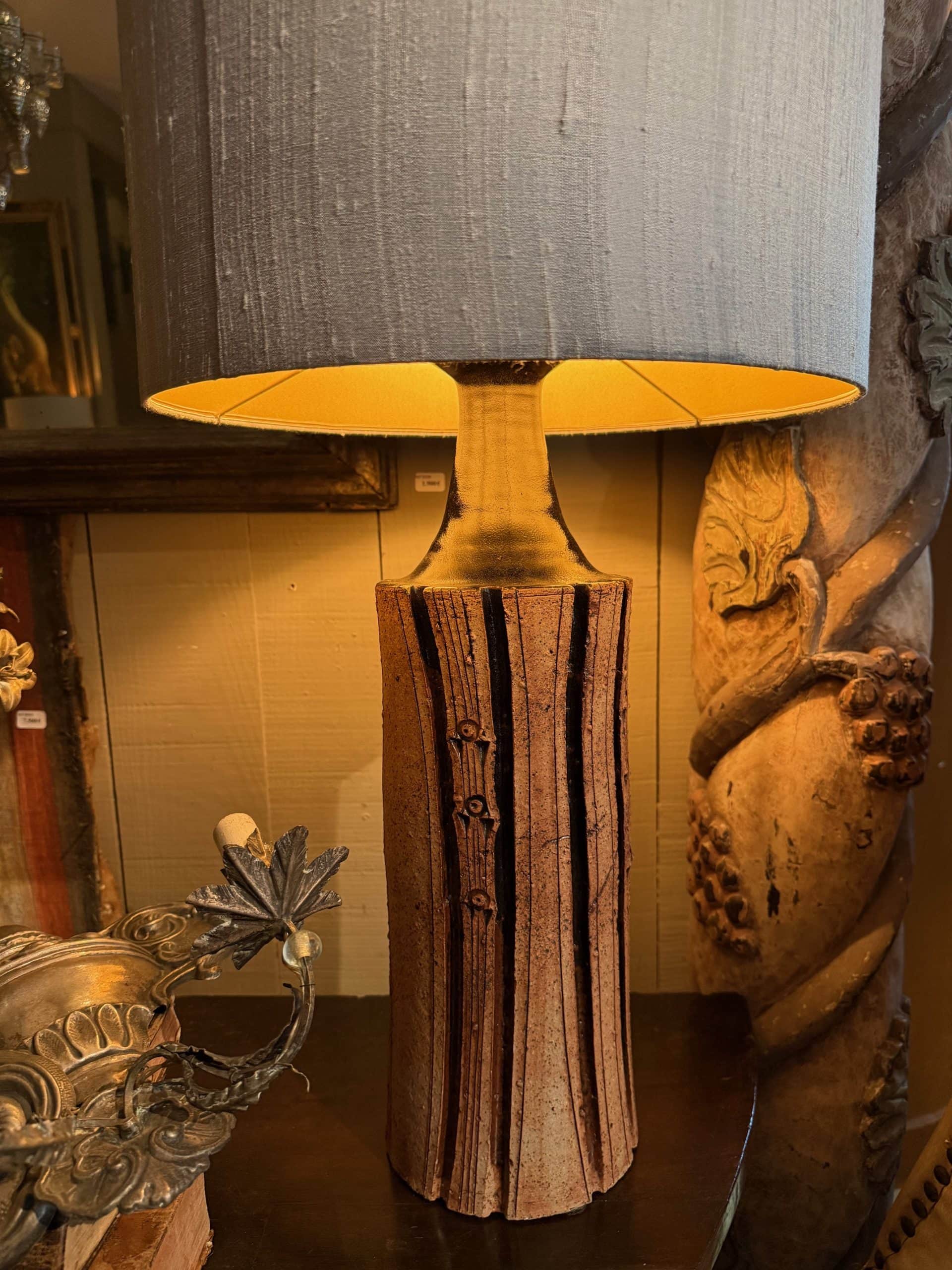 Paire de lampes en céramique “écorce de bois” + A/J cylindre en soie grise ca.1960