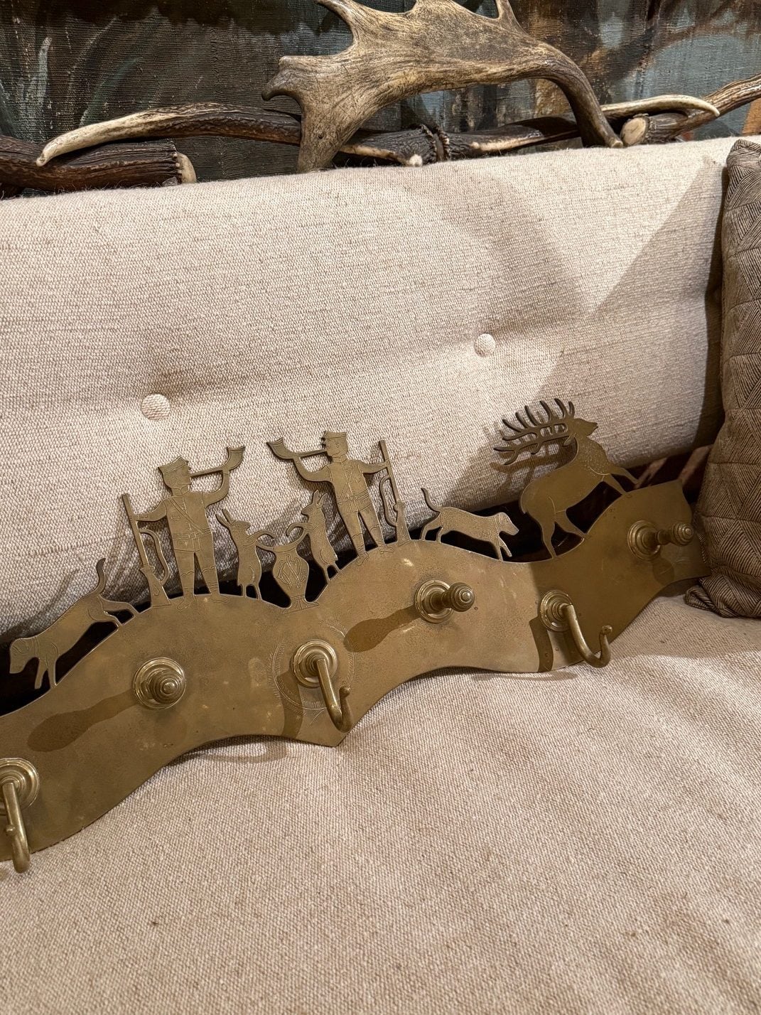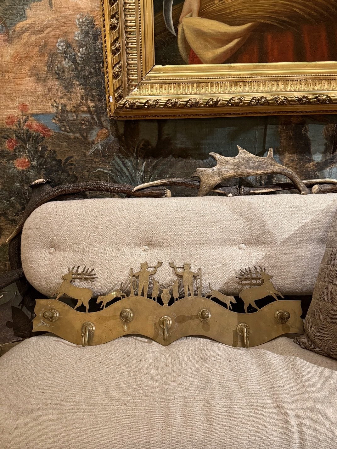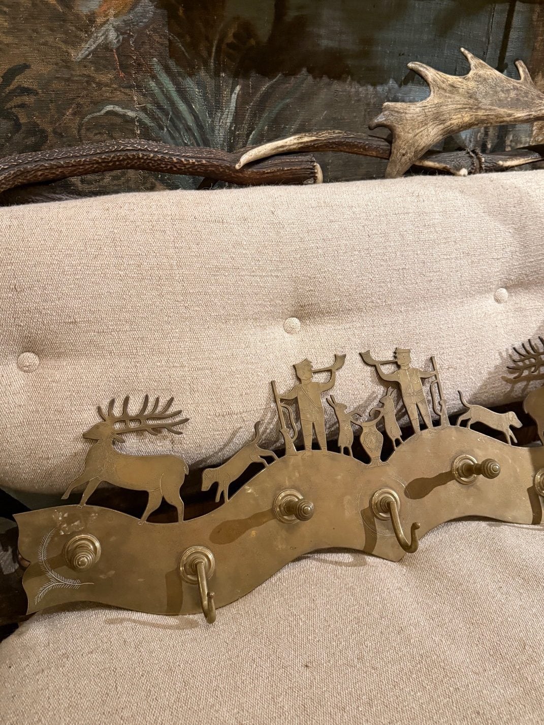 Portemanteau en laiton massif décor “chasseur cerf & lièvre”