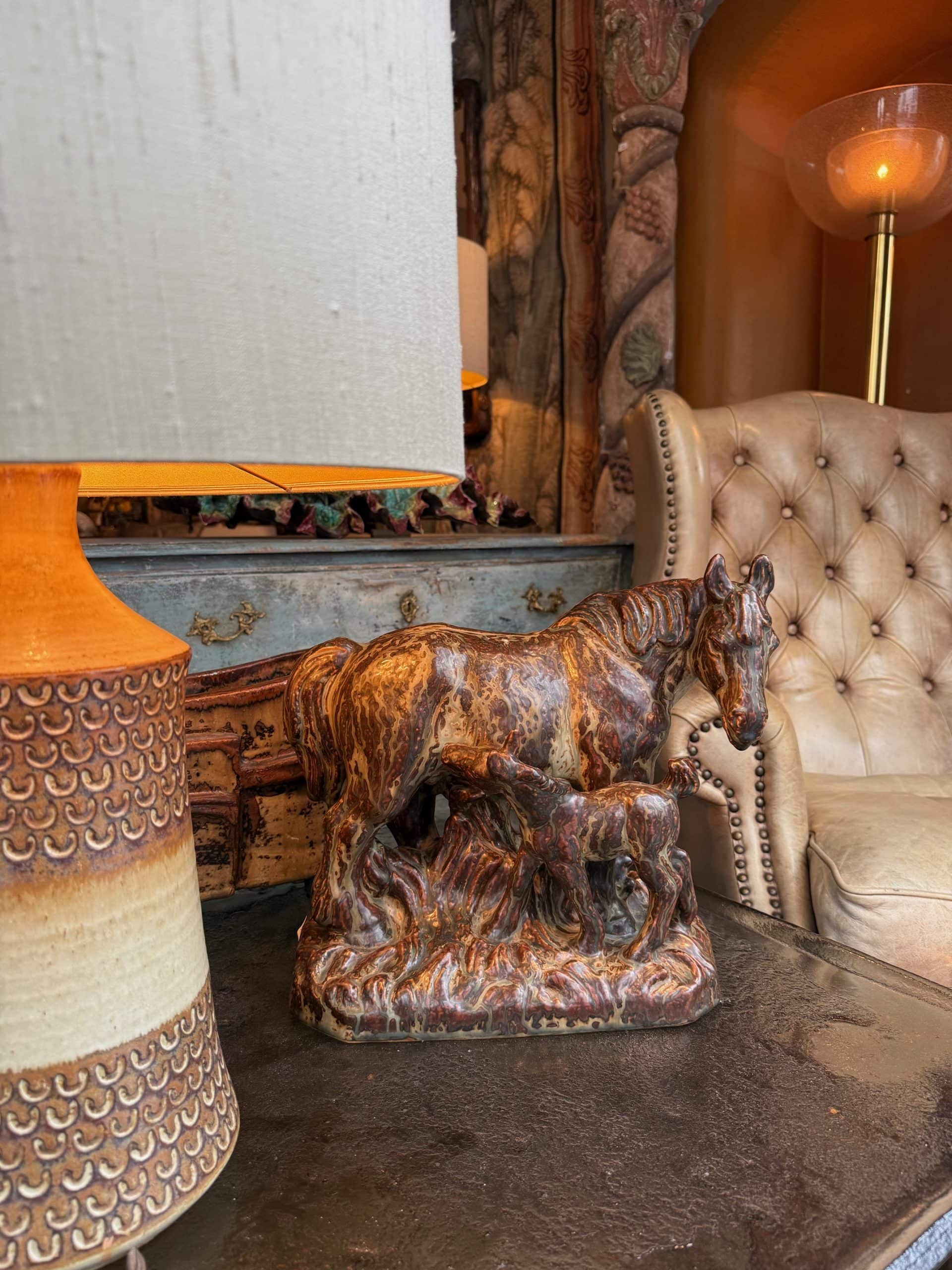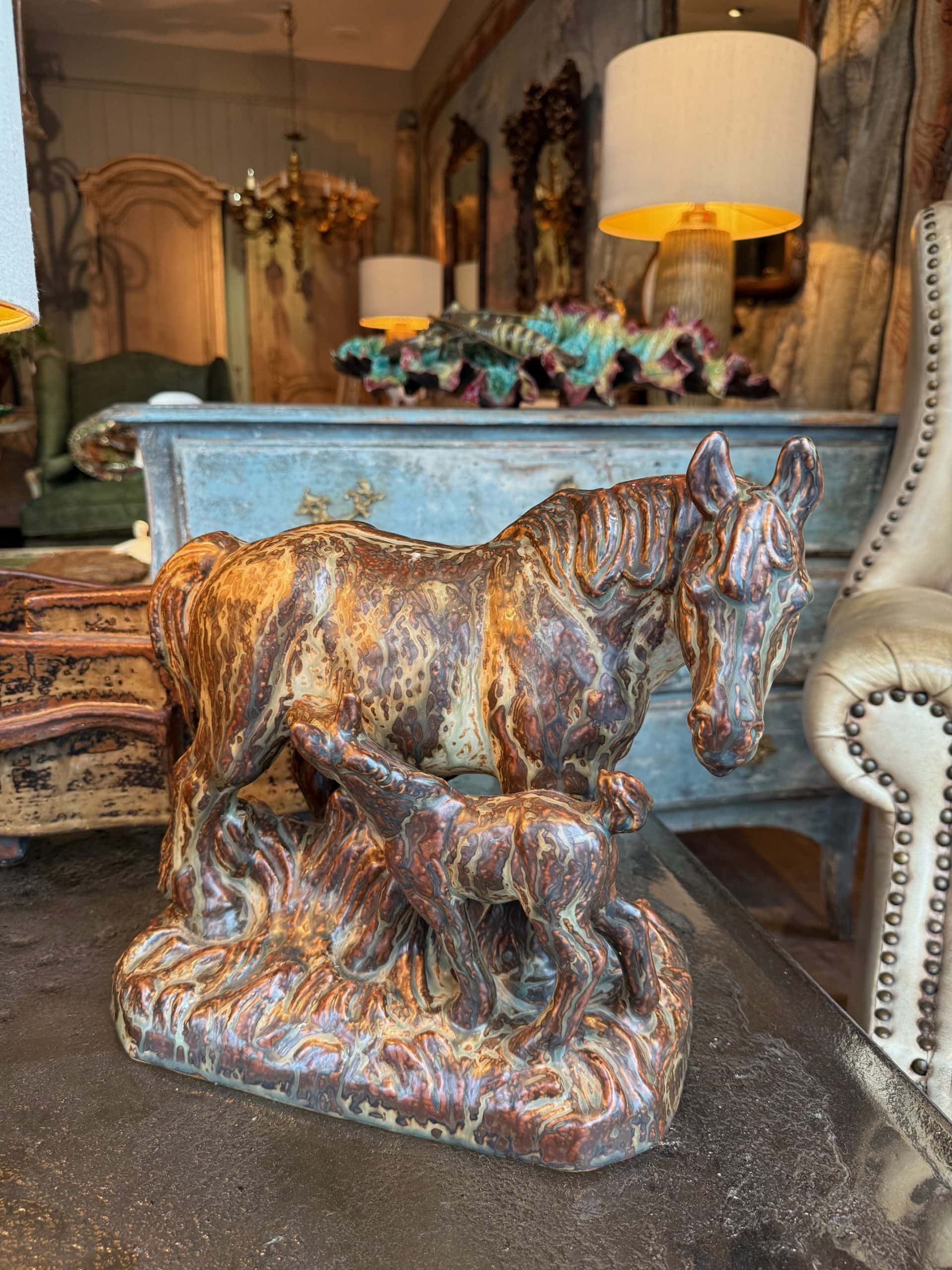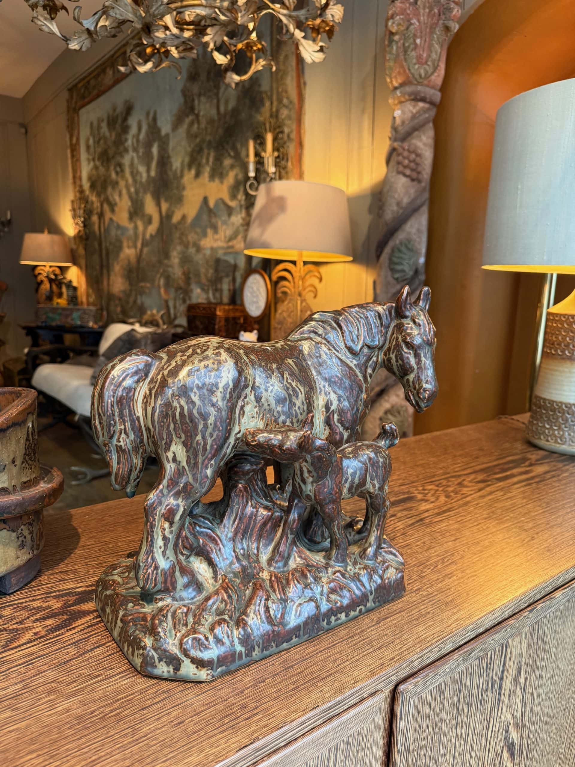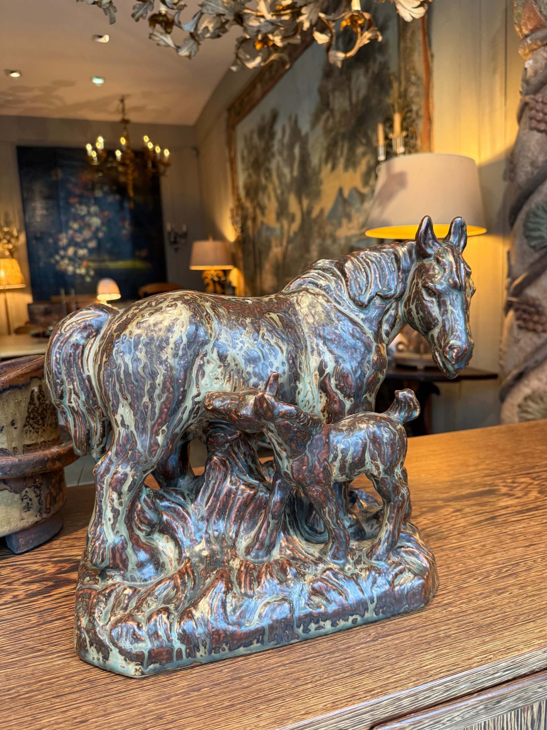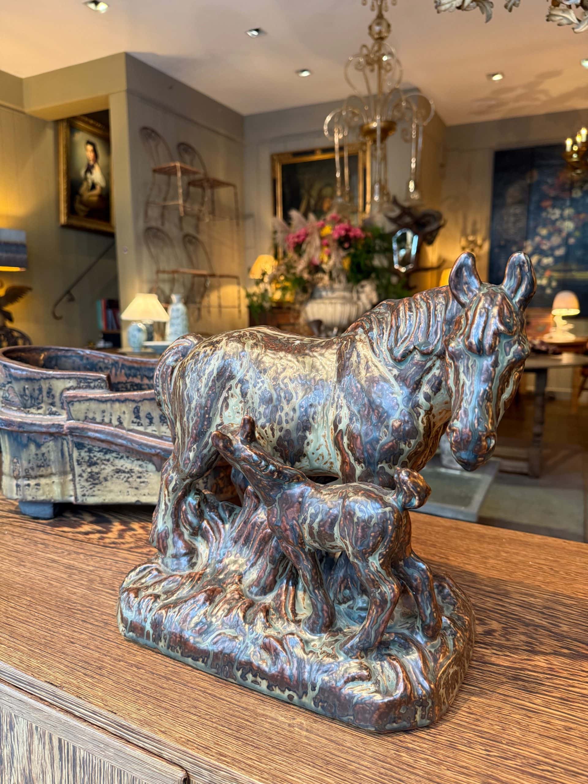Sculpture en procelaine d’une jument et son poulain par KNUD KYHN email brun pour Royal Copenhagen ca.1950