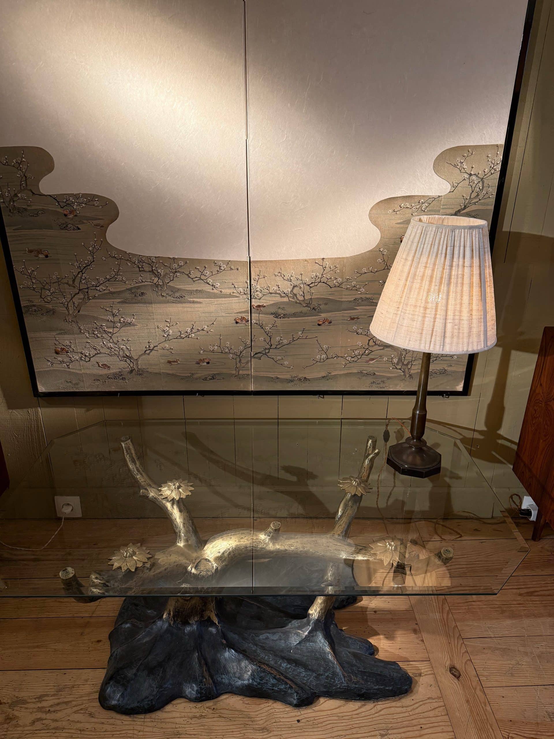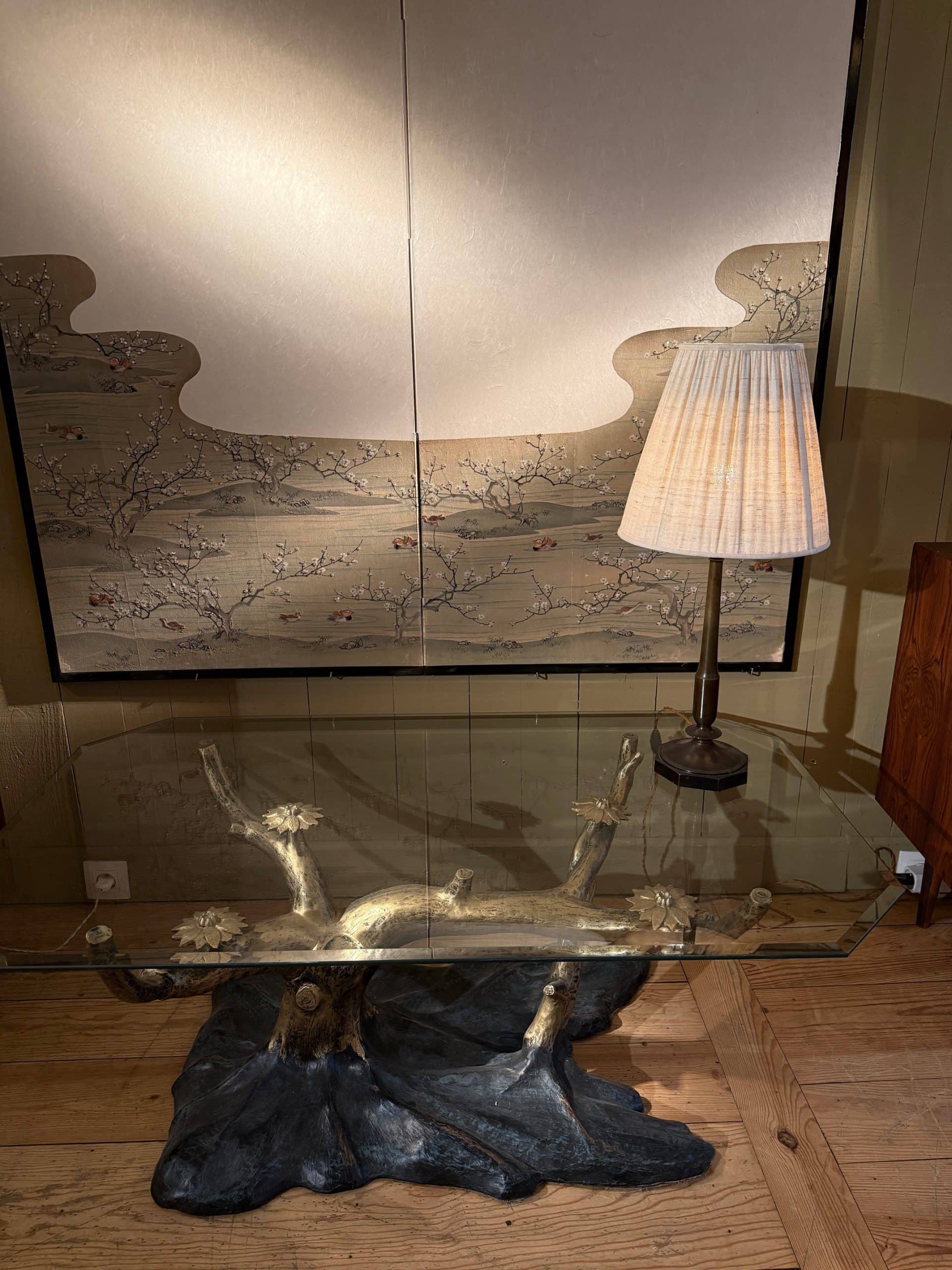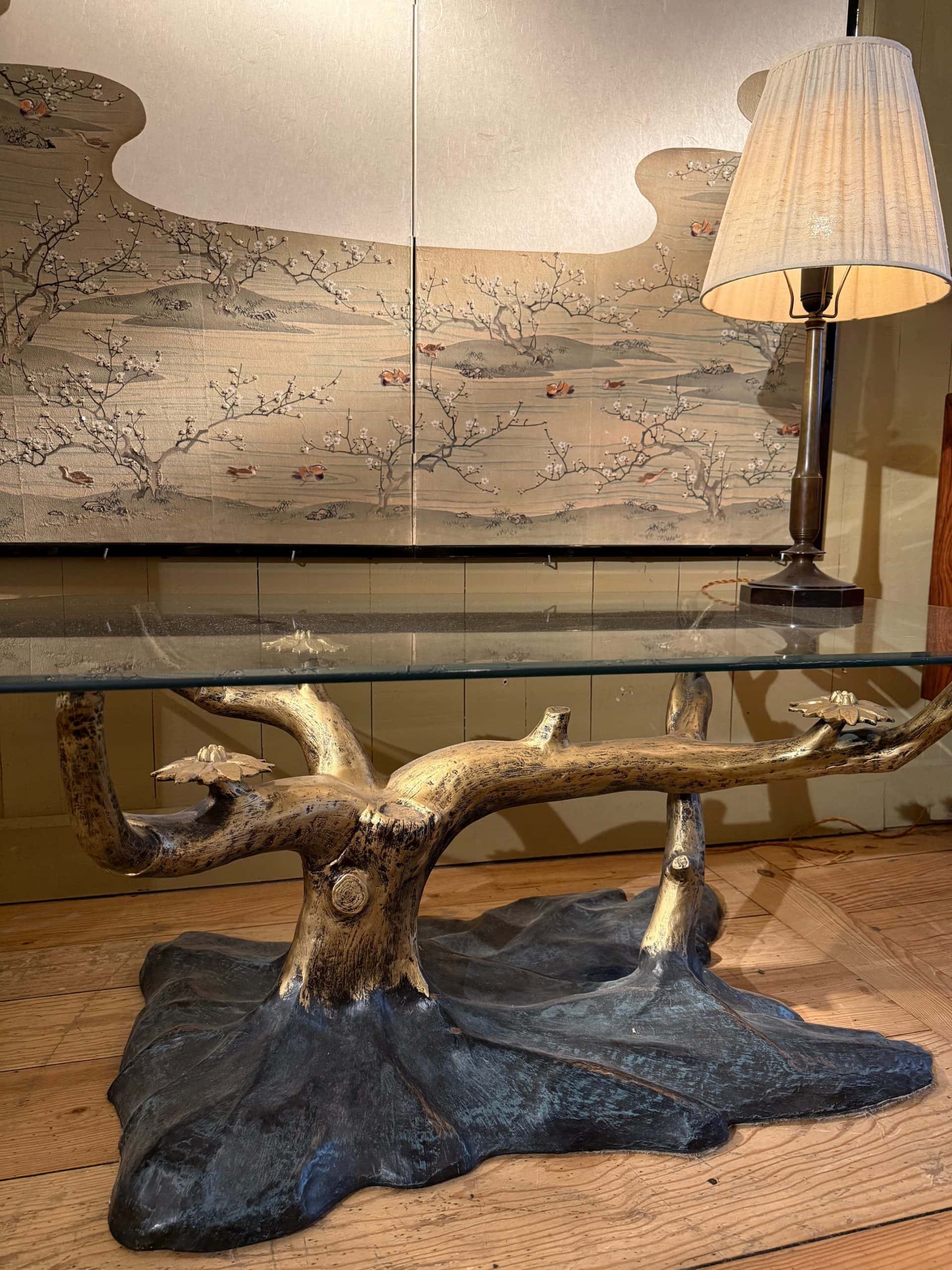 Table basse “bonsaï” patine vert de gris & or – plateau verre biseauté ca.1970