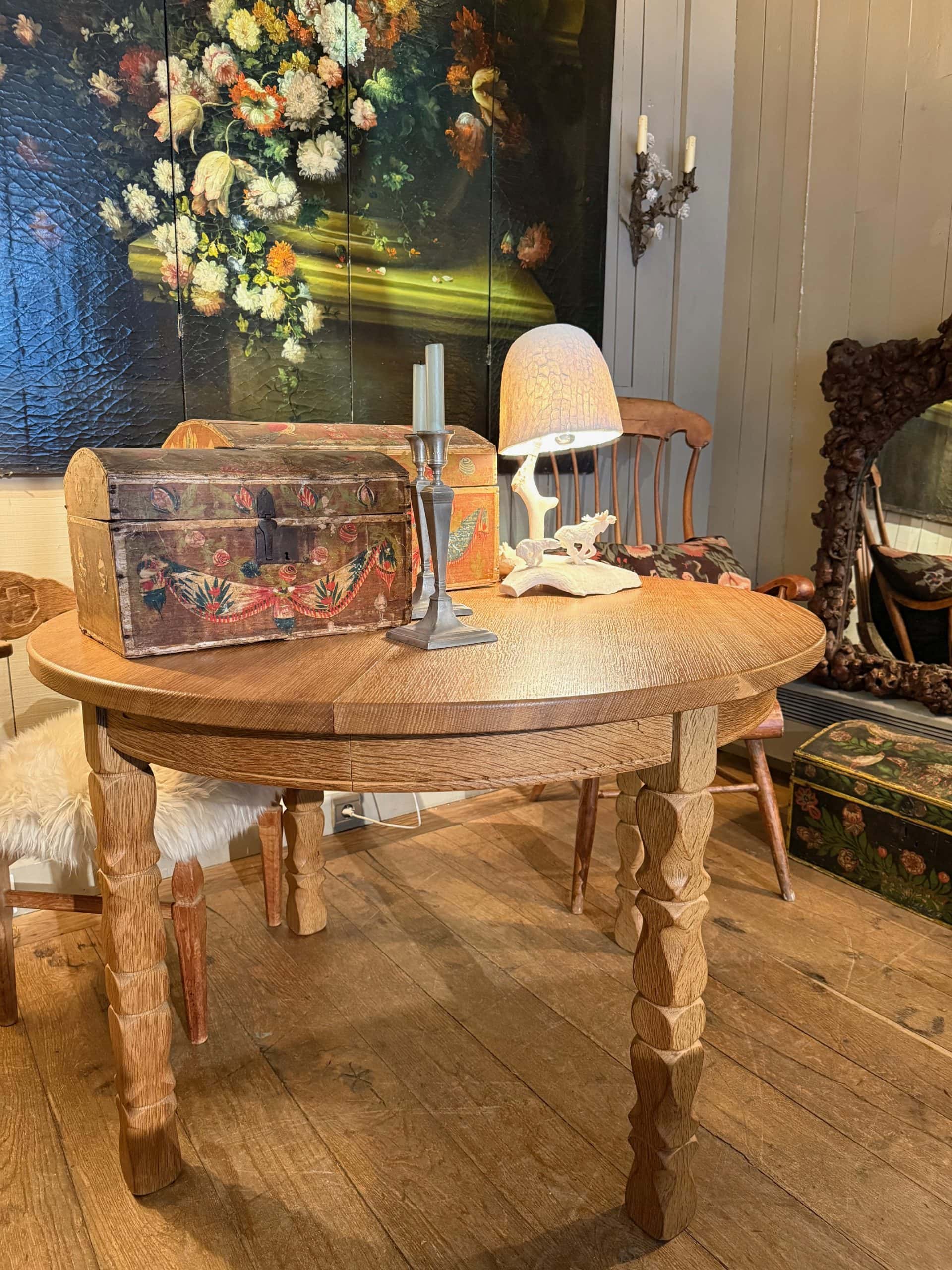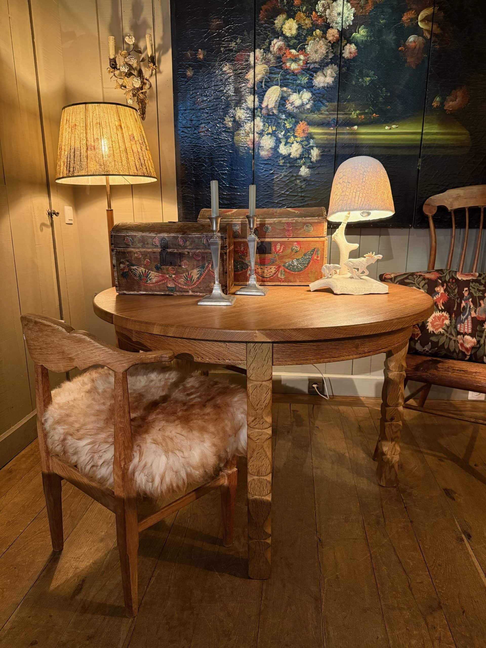 Table ronde en chêne naturel pieds sculptés- Danemark ca.1960