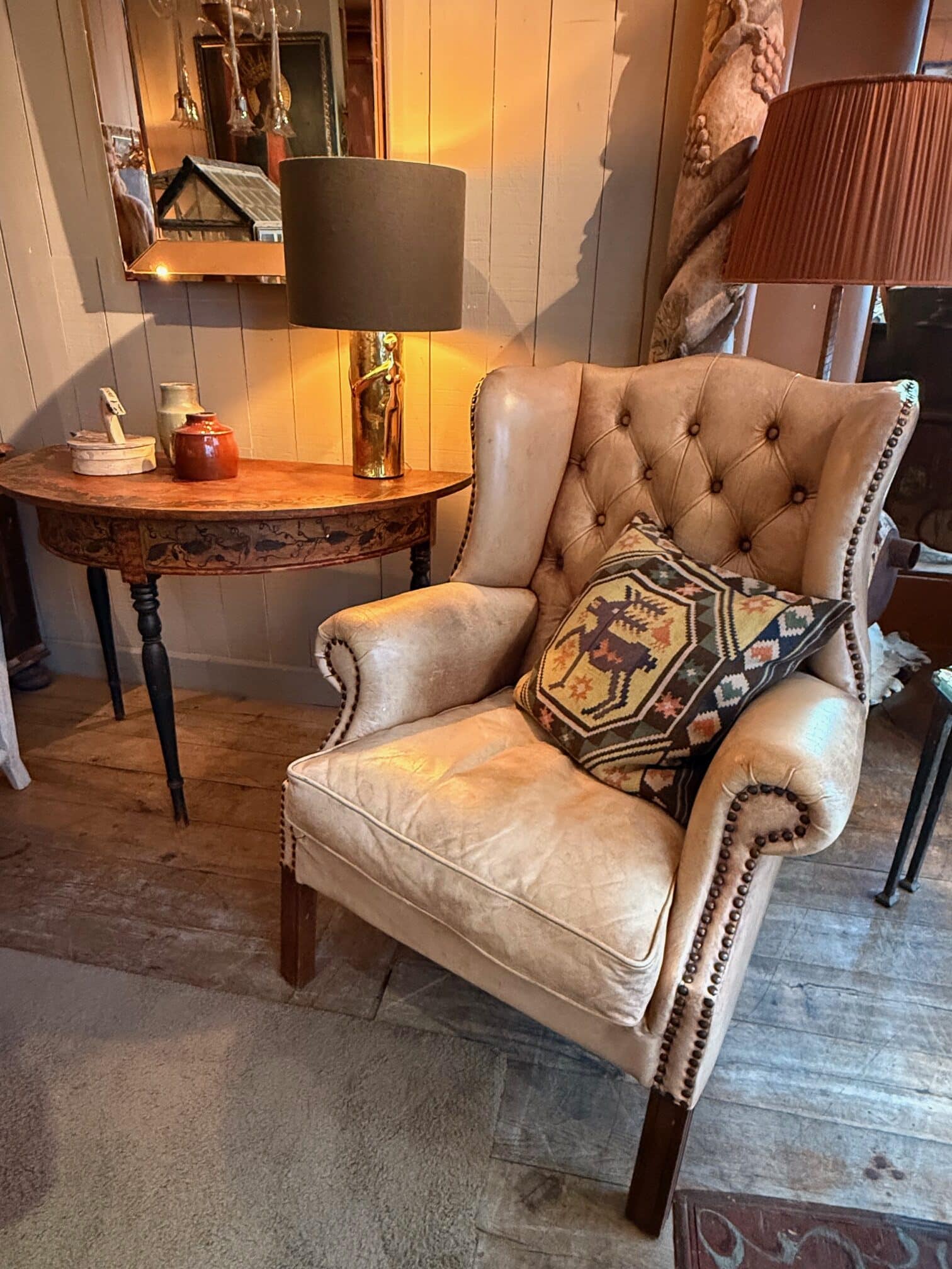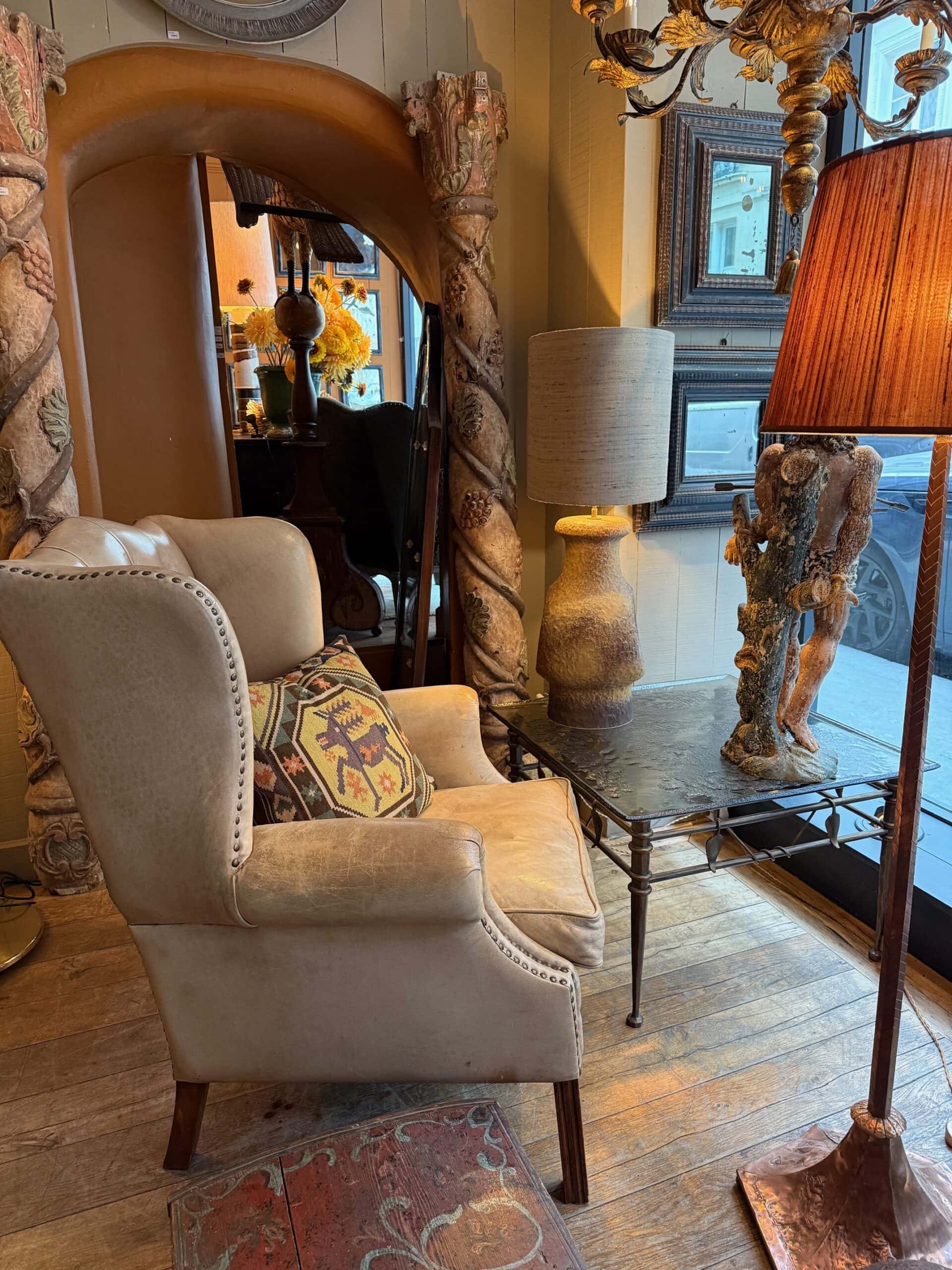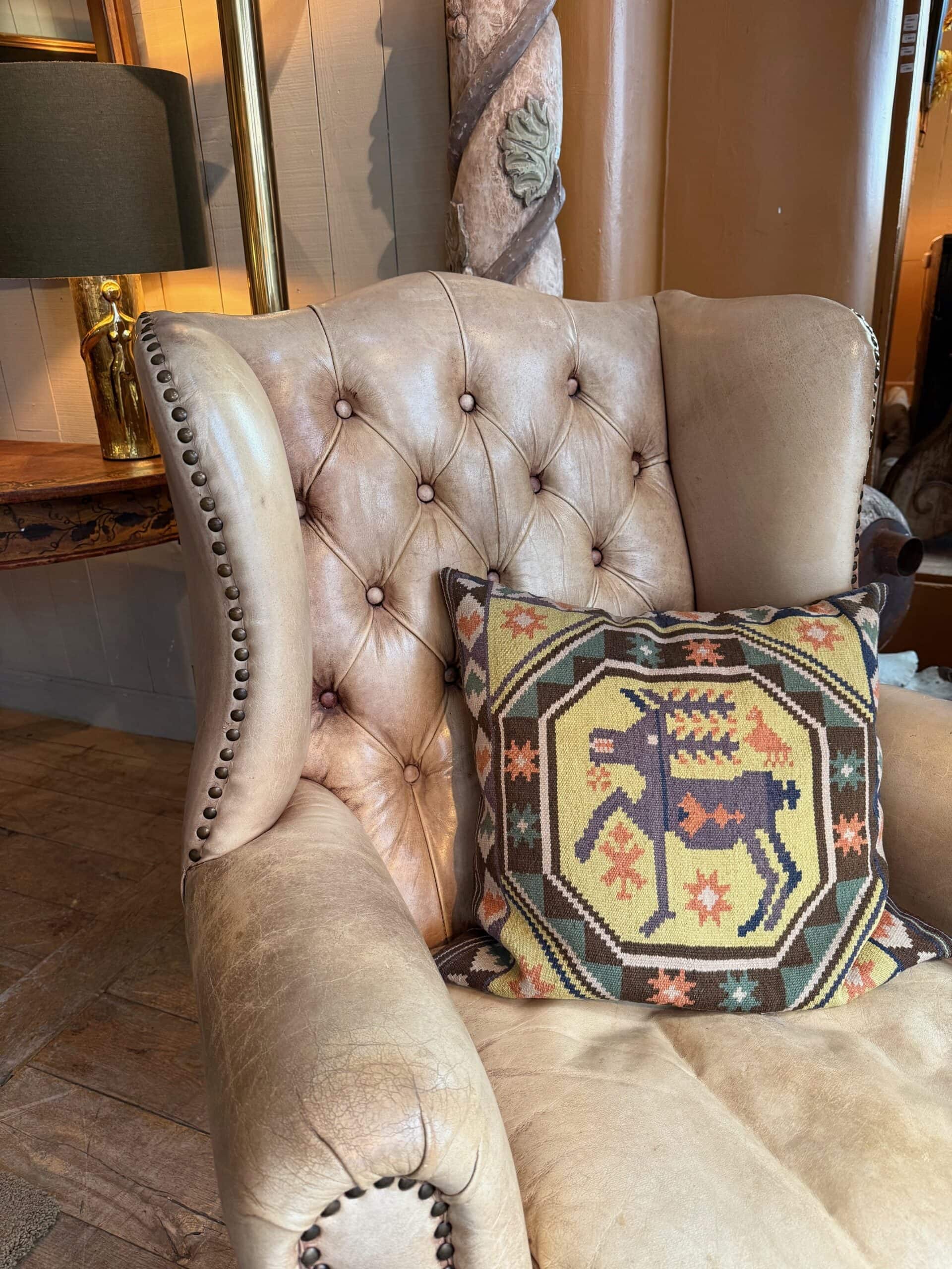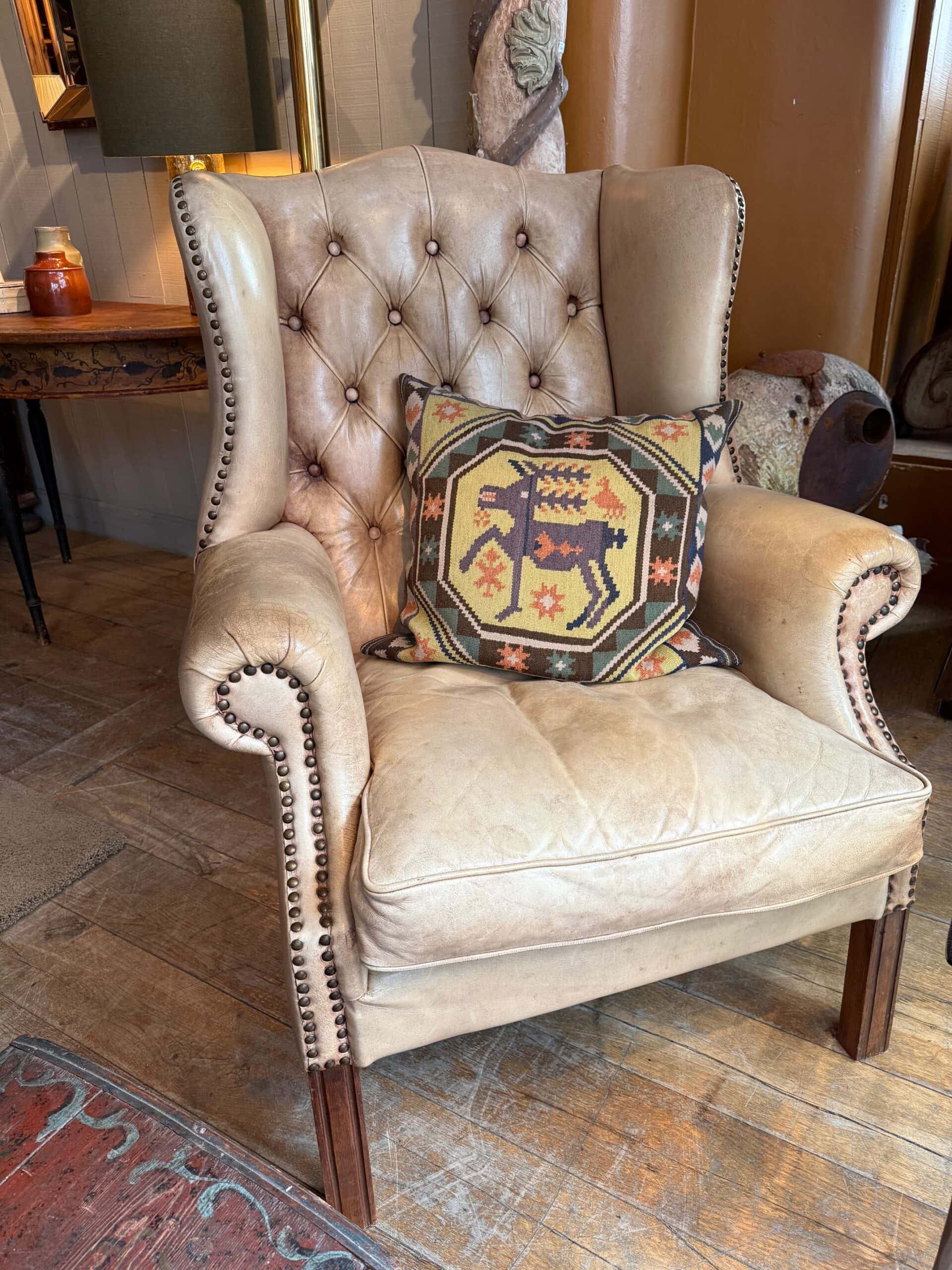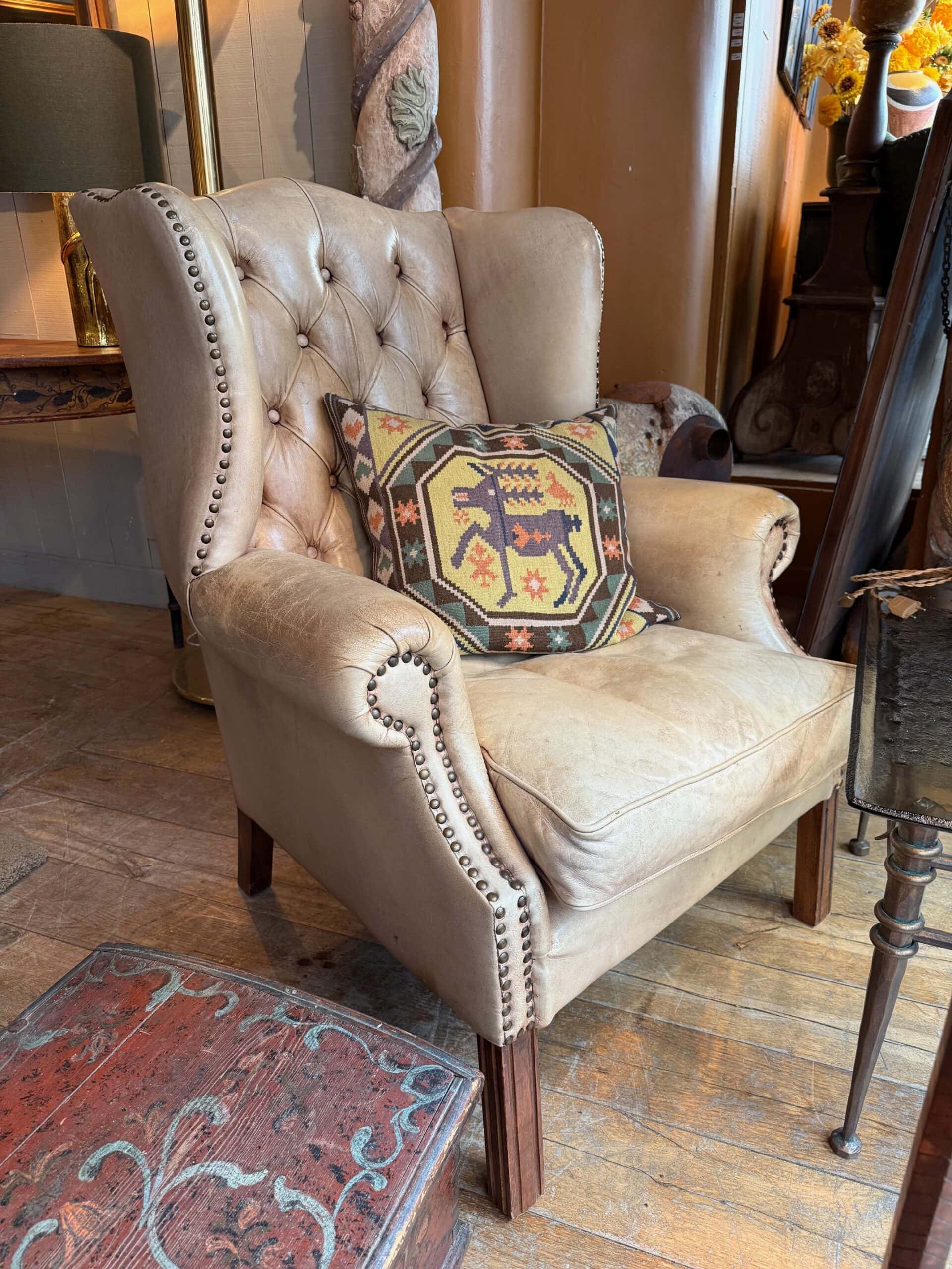 Fauteuil à oreilles en cuir beige capitonné – ca.1880