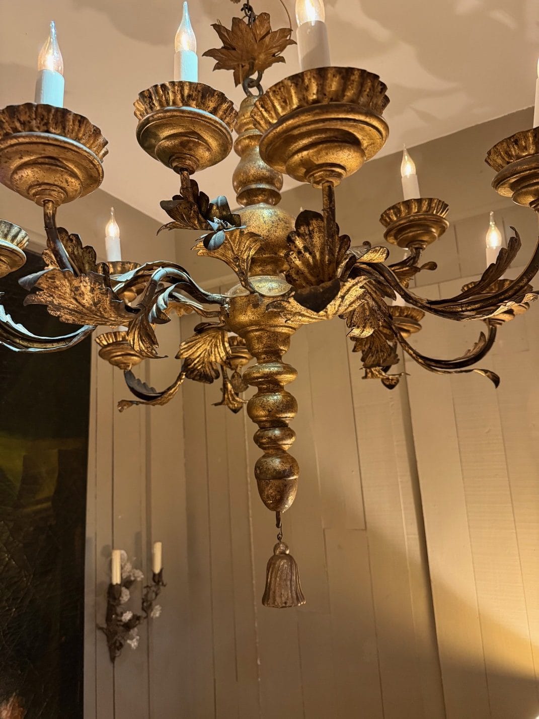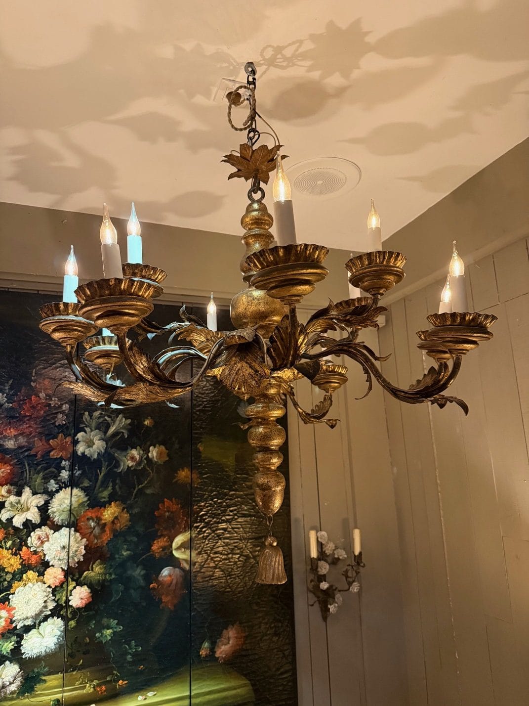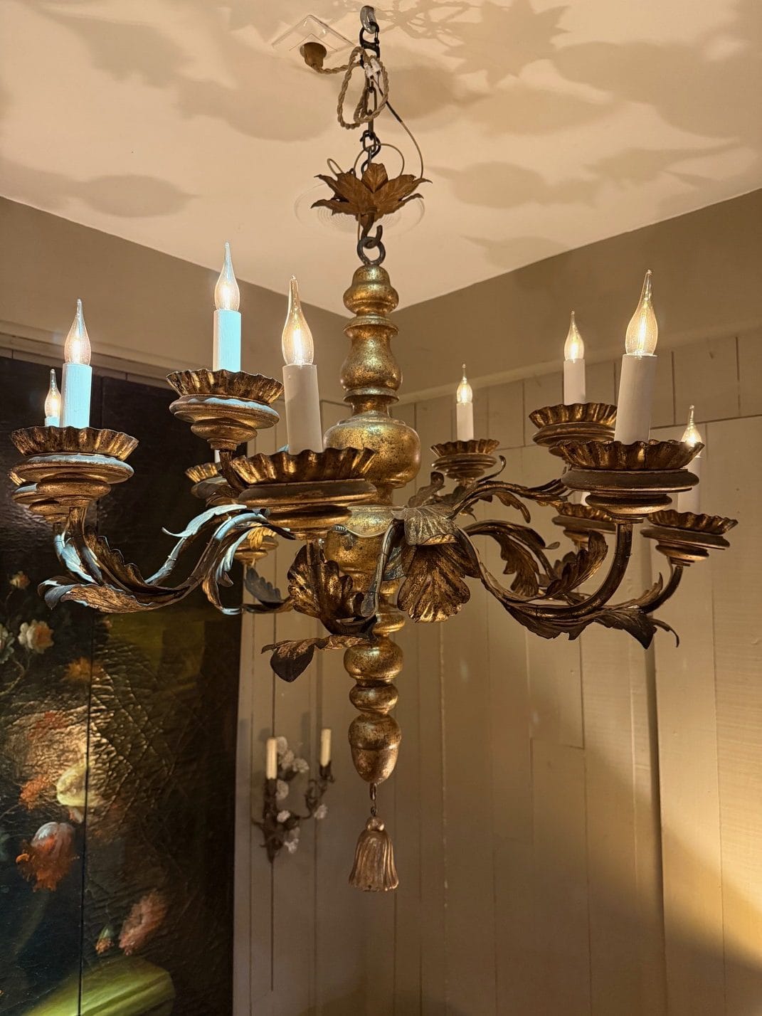 Grand lustre baroque en bois doré et feuille d’acanthes en tôle bronze – Italie XIXe
