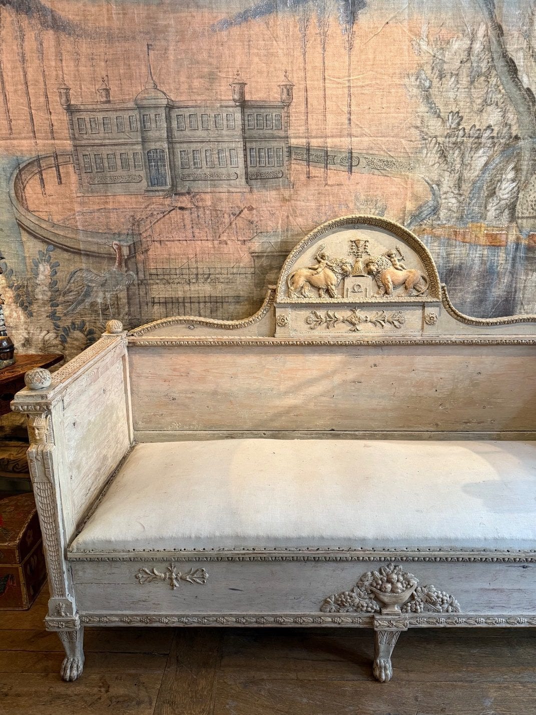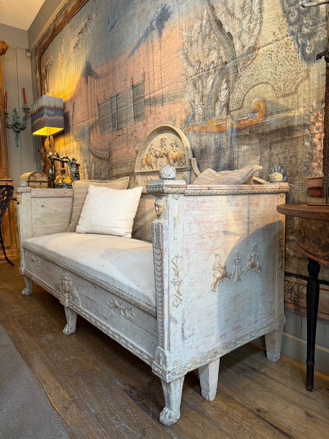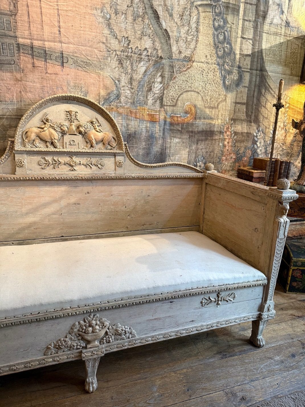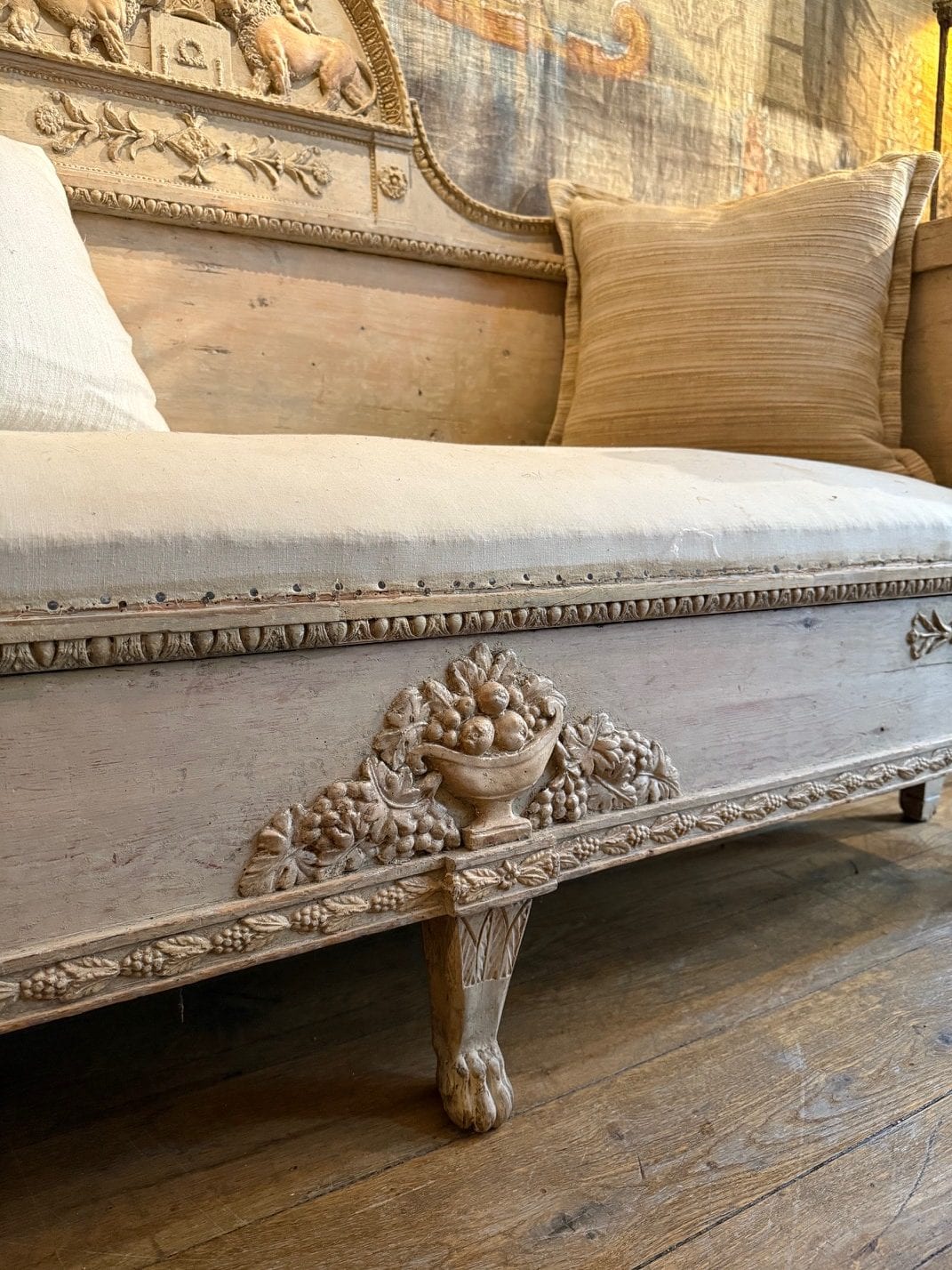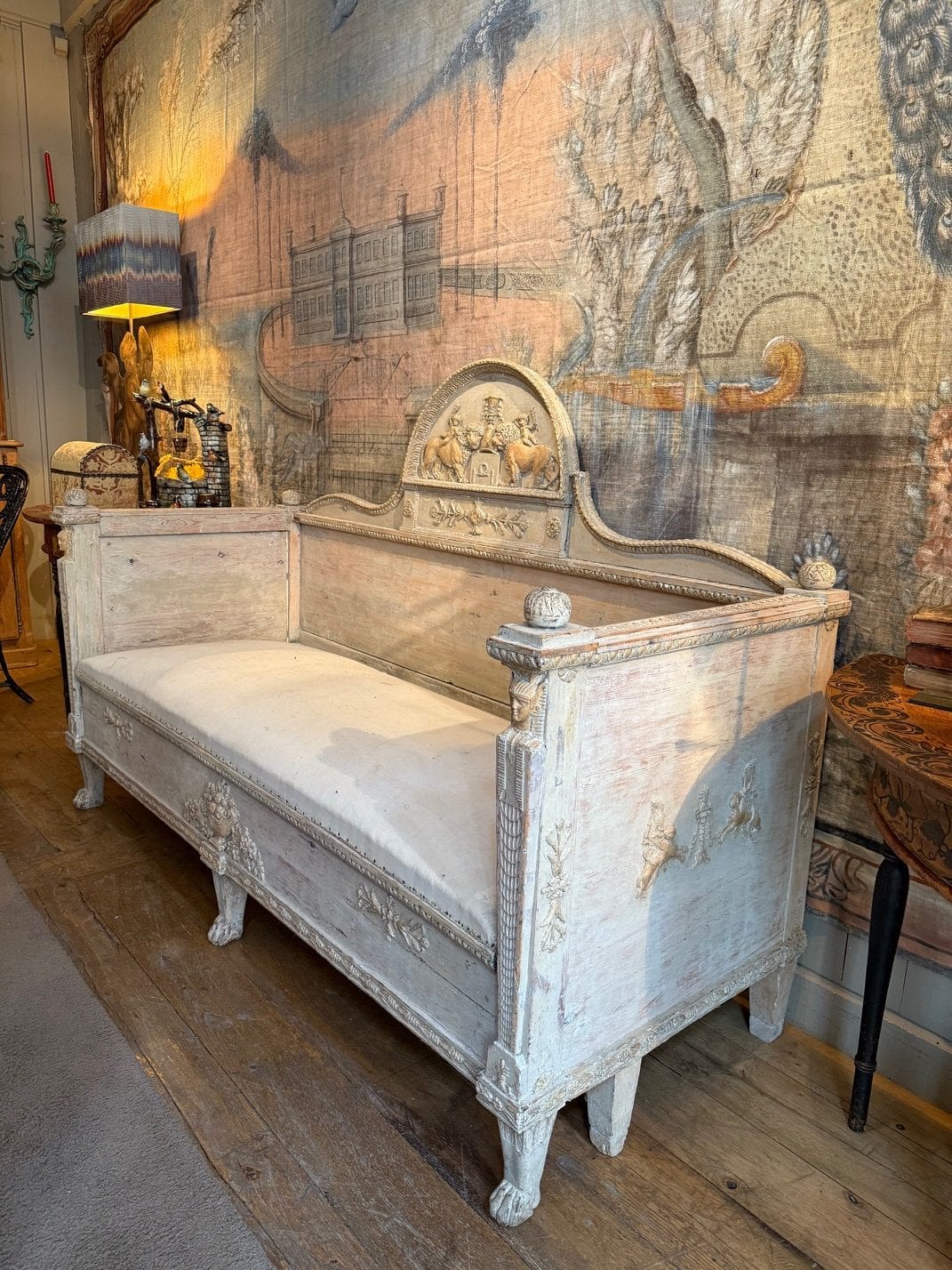 Grande banquette gustavienne en bois sculpté, patine blanche ca.1860