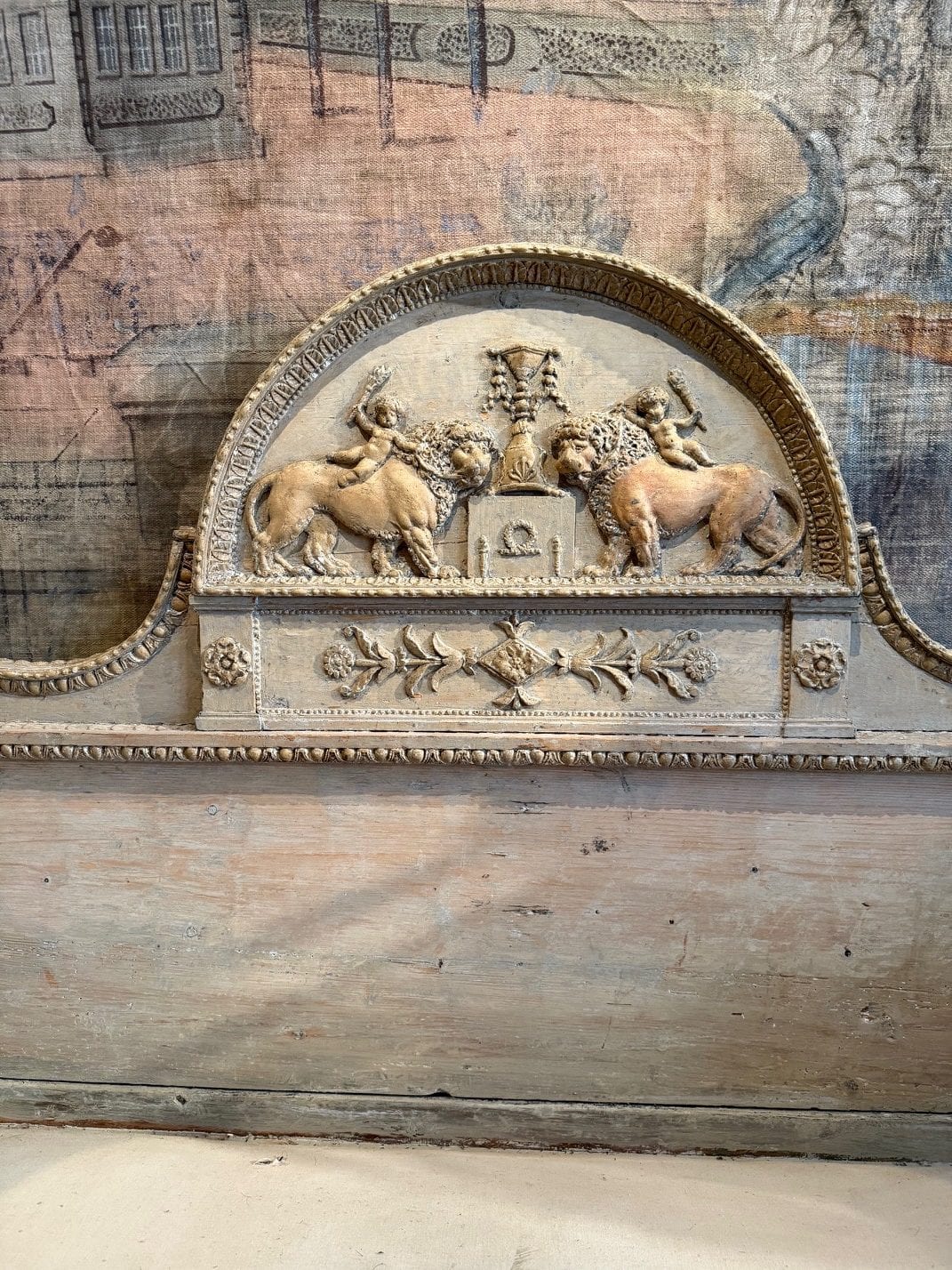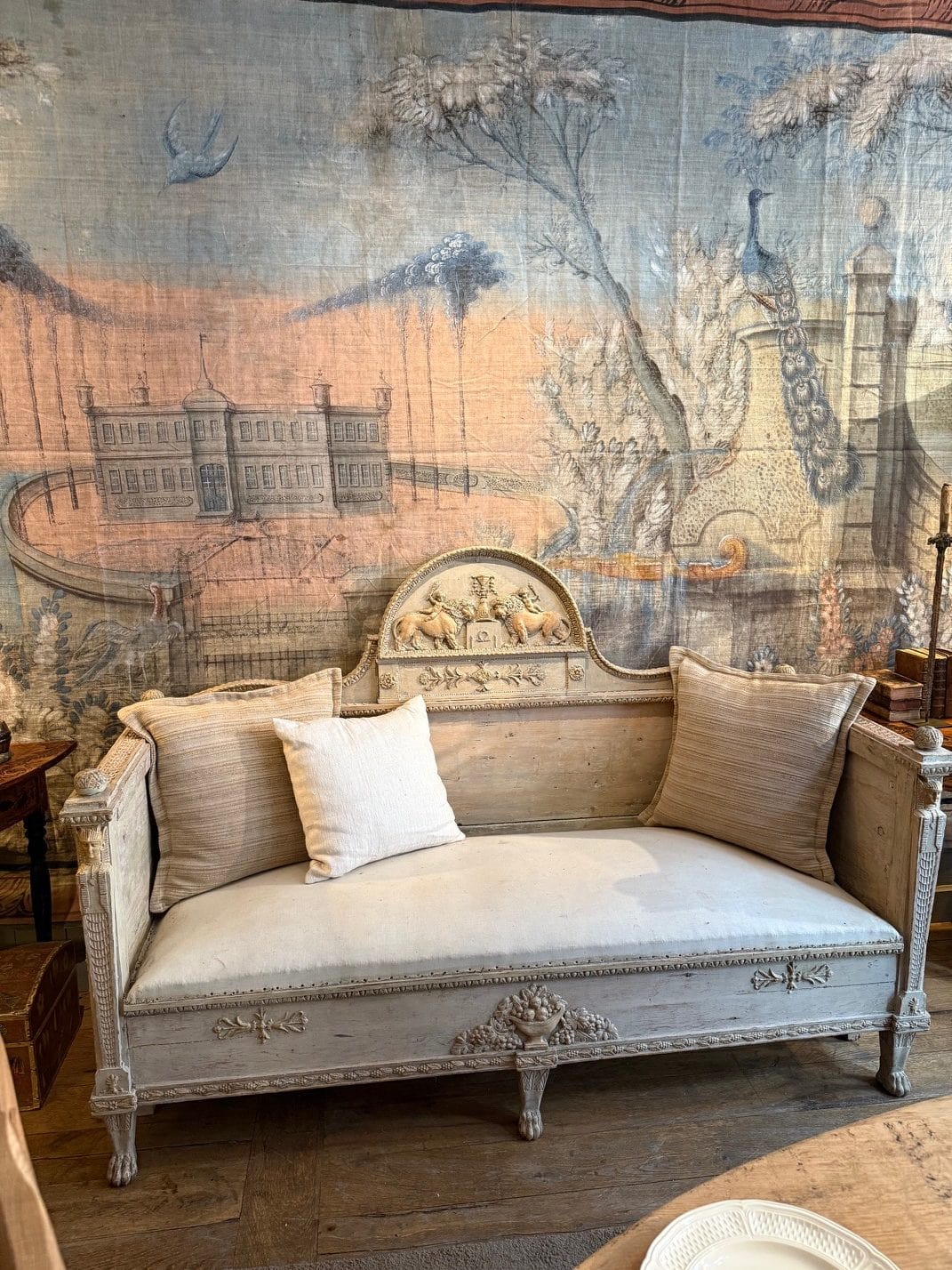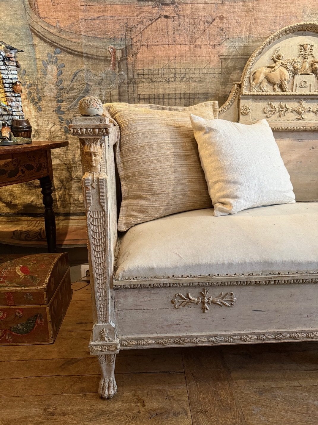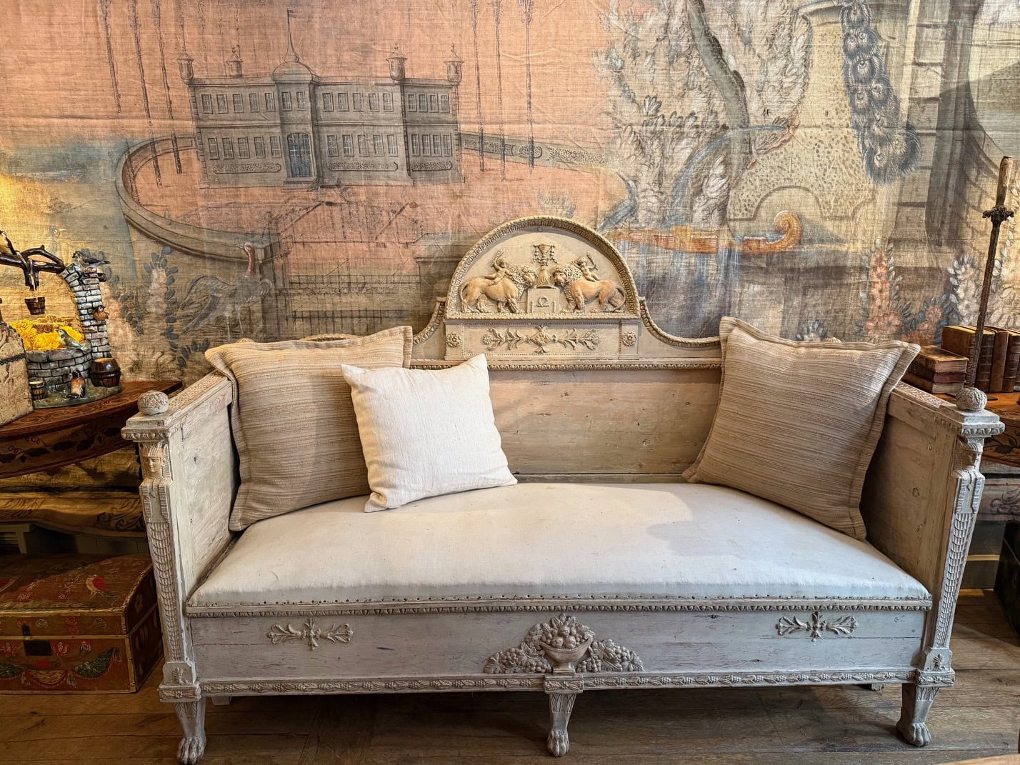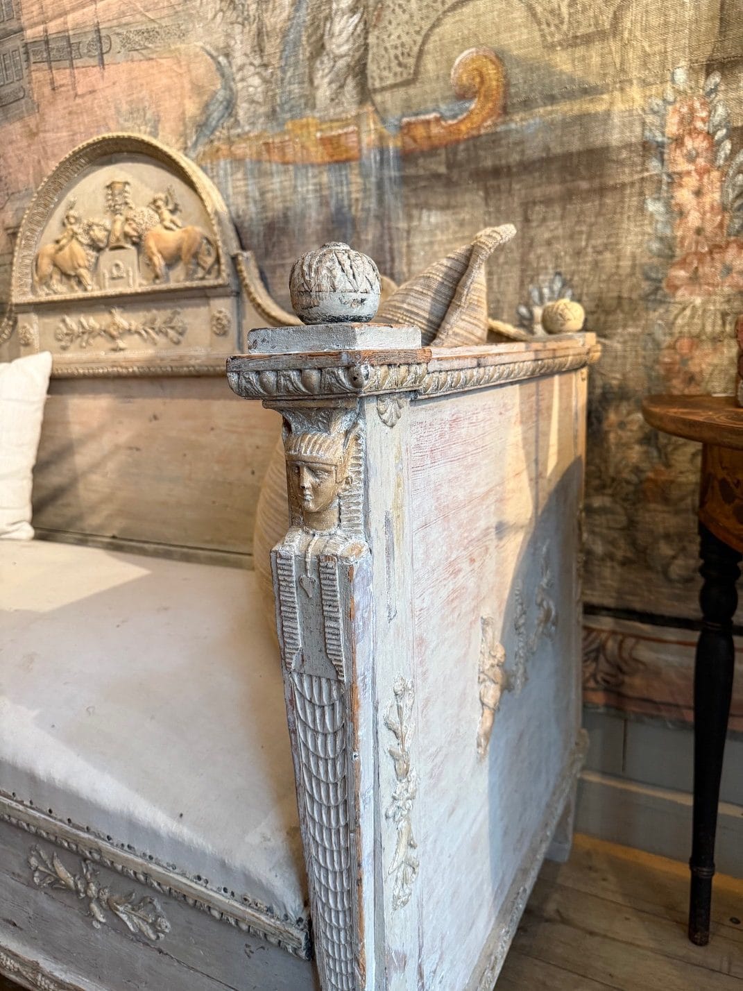 Grande banquette gustavienne en bois sculpté, patine blanche ca.1860
