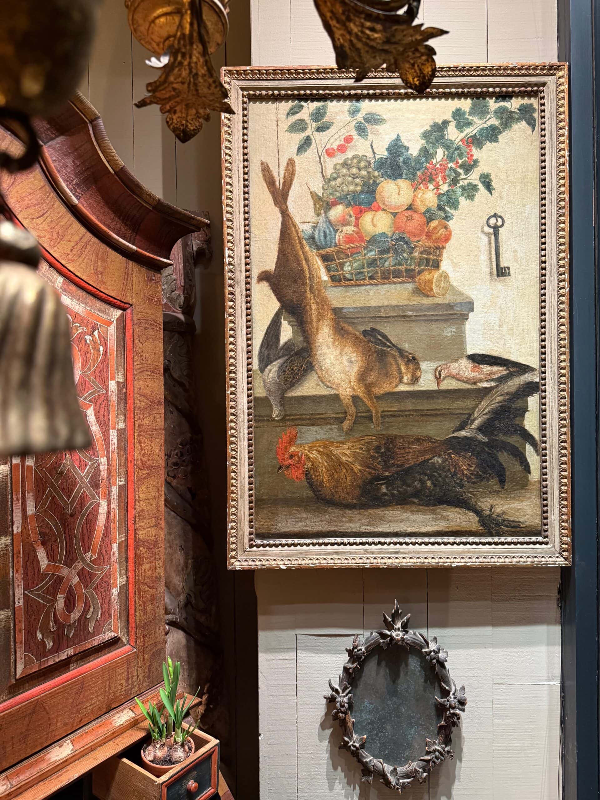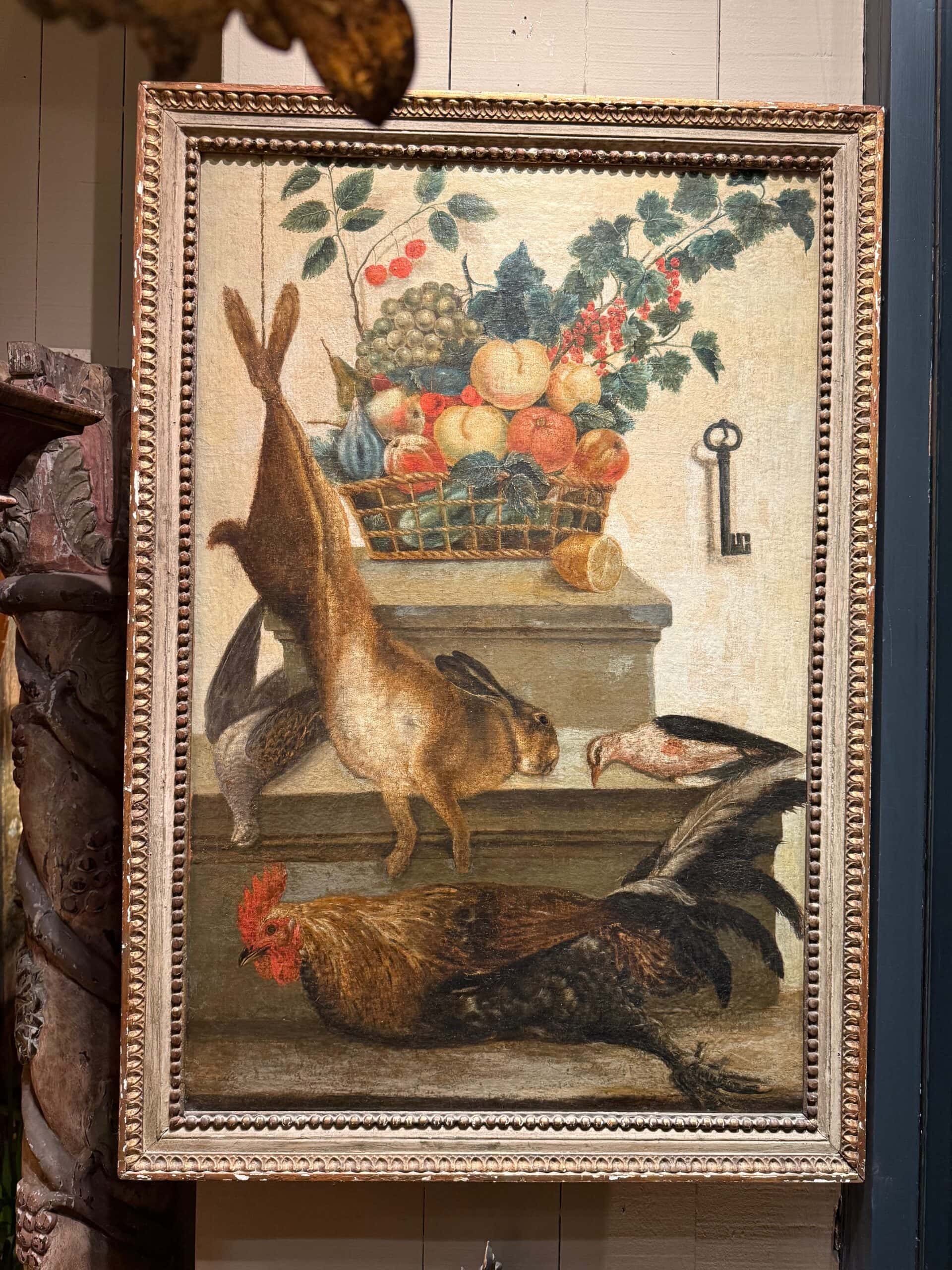 Huile sur toile nature morte à la corbeille de fruits et au gibier – École française XVIIIe, vers 1750