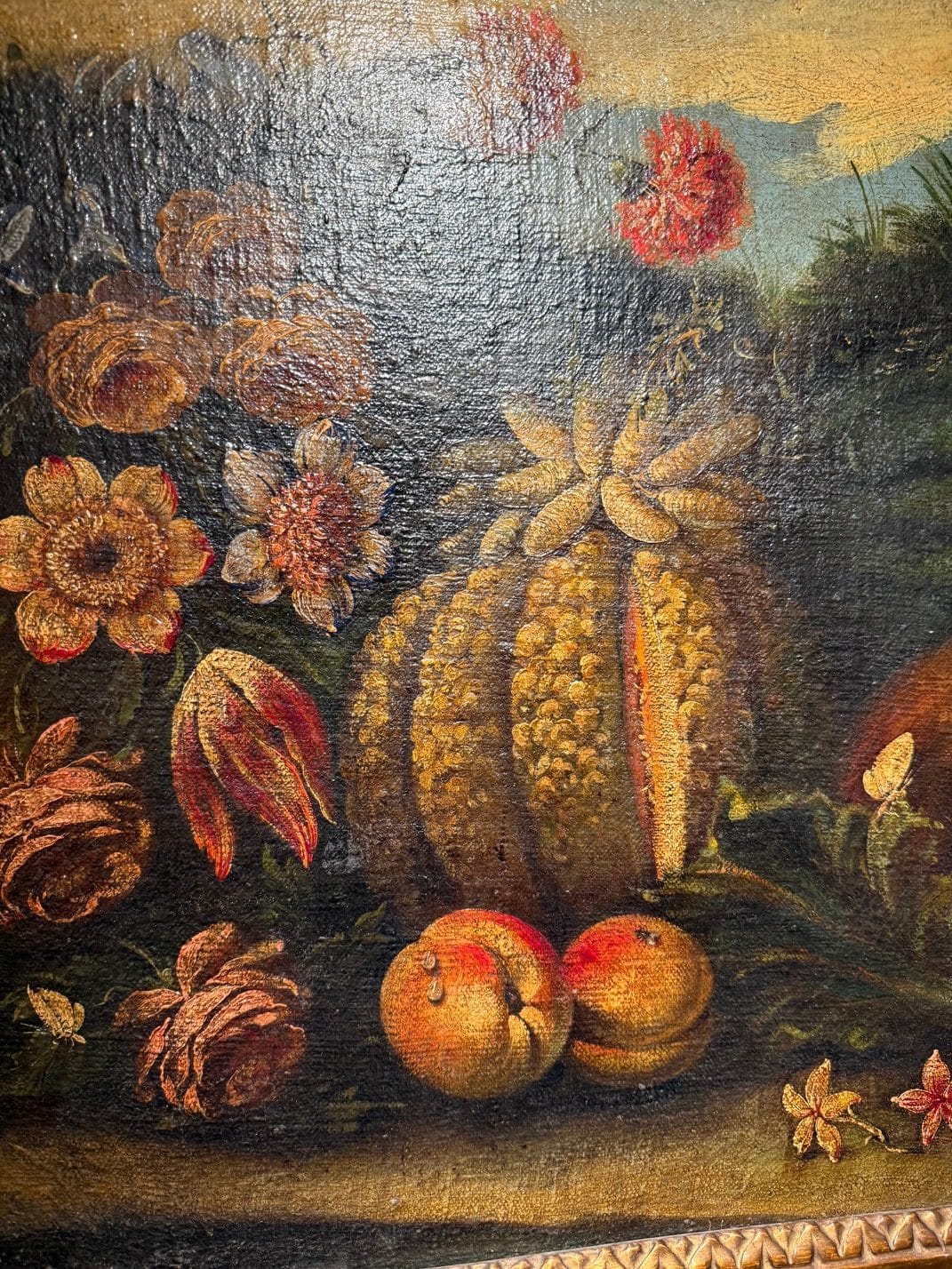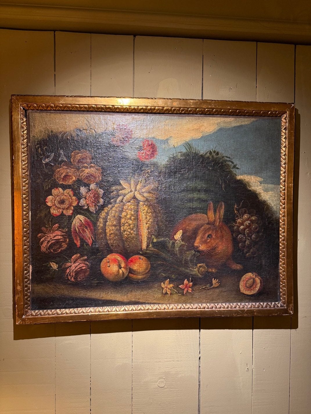Huile sur toile nature morte “Lapin & Papillon – Fleurs & fruits” -Italie XIXE