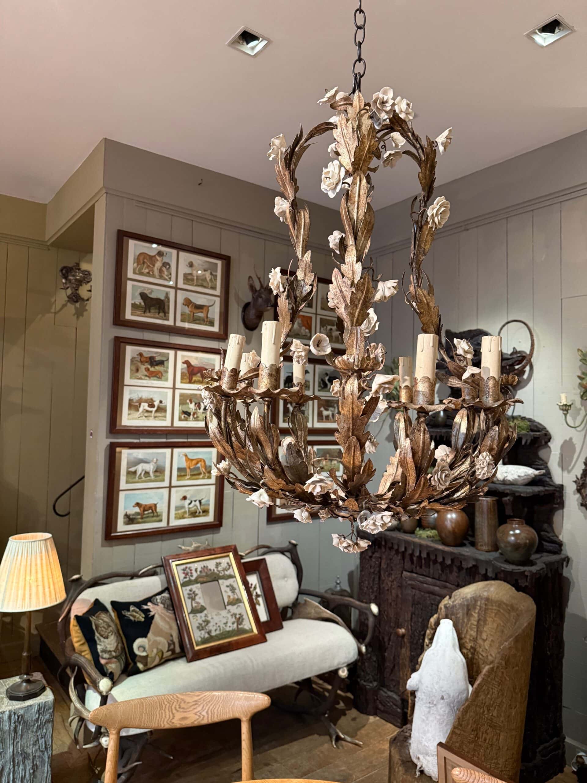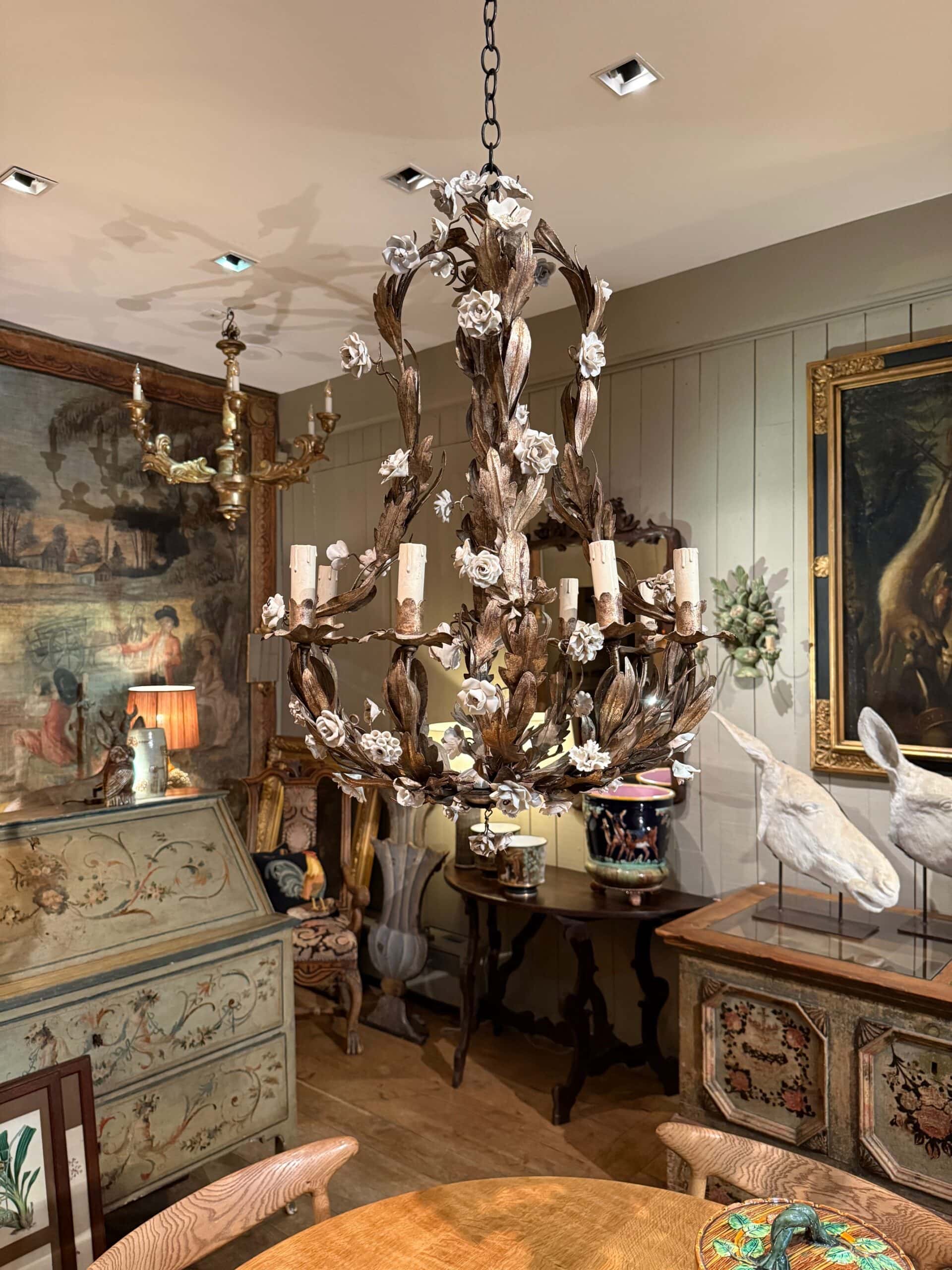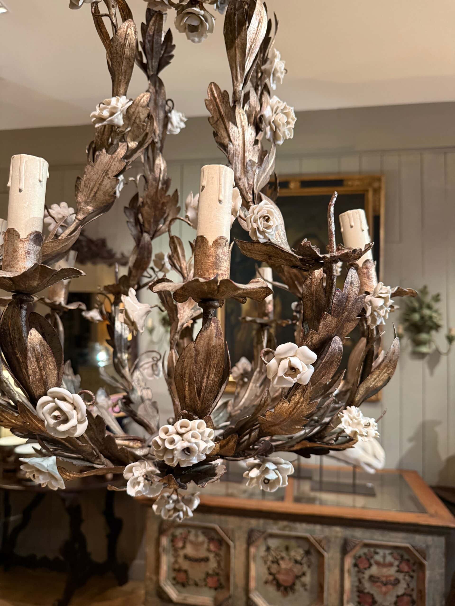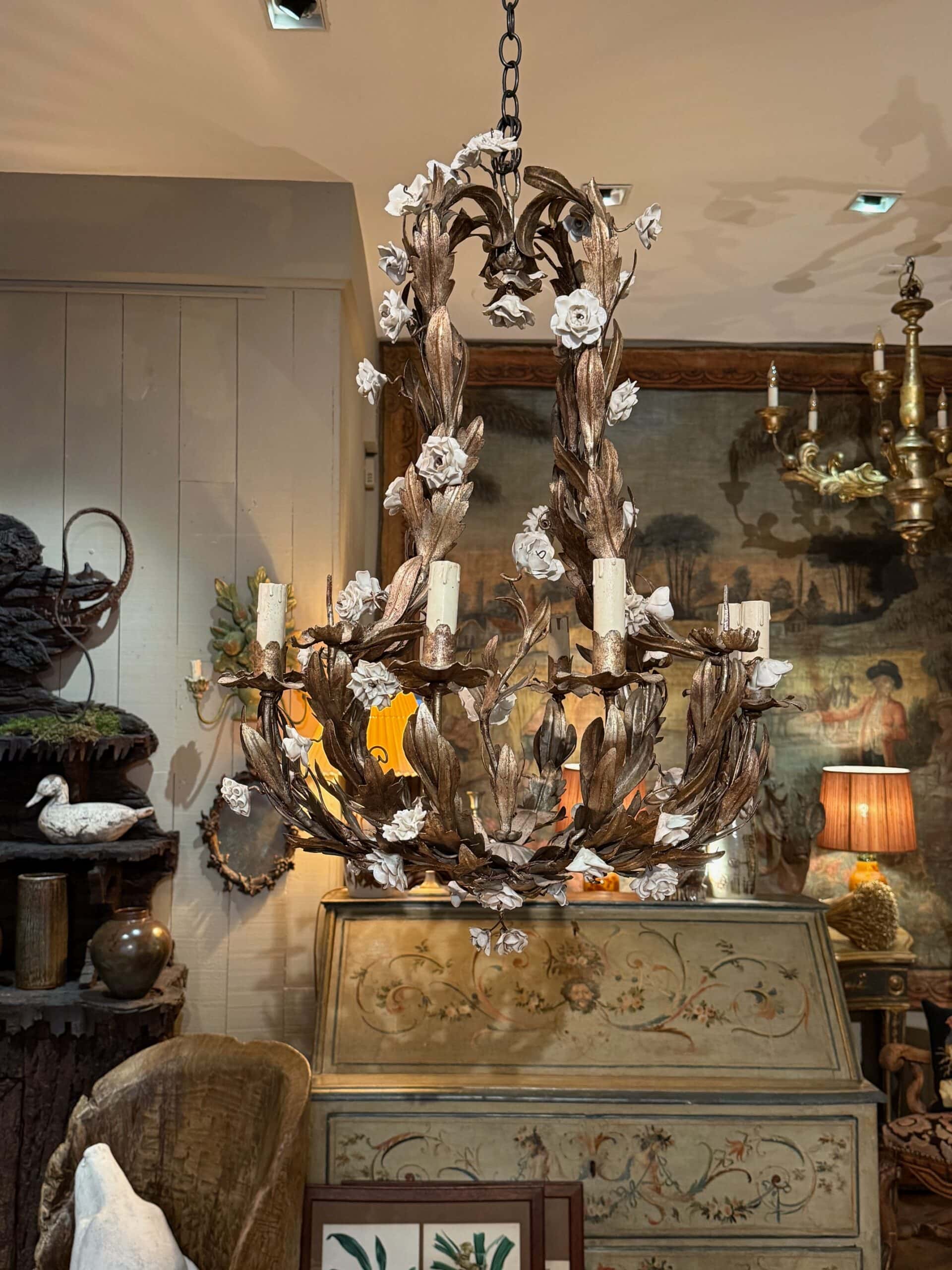 Lustre en tôle argentée & fleurs en porcelaine ivoire – Italie XIXe