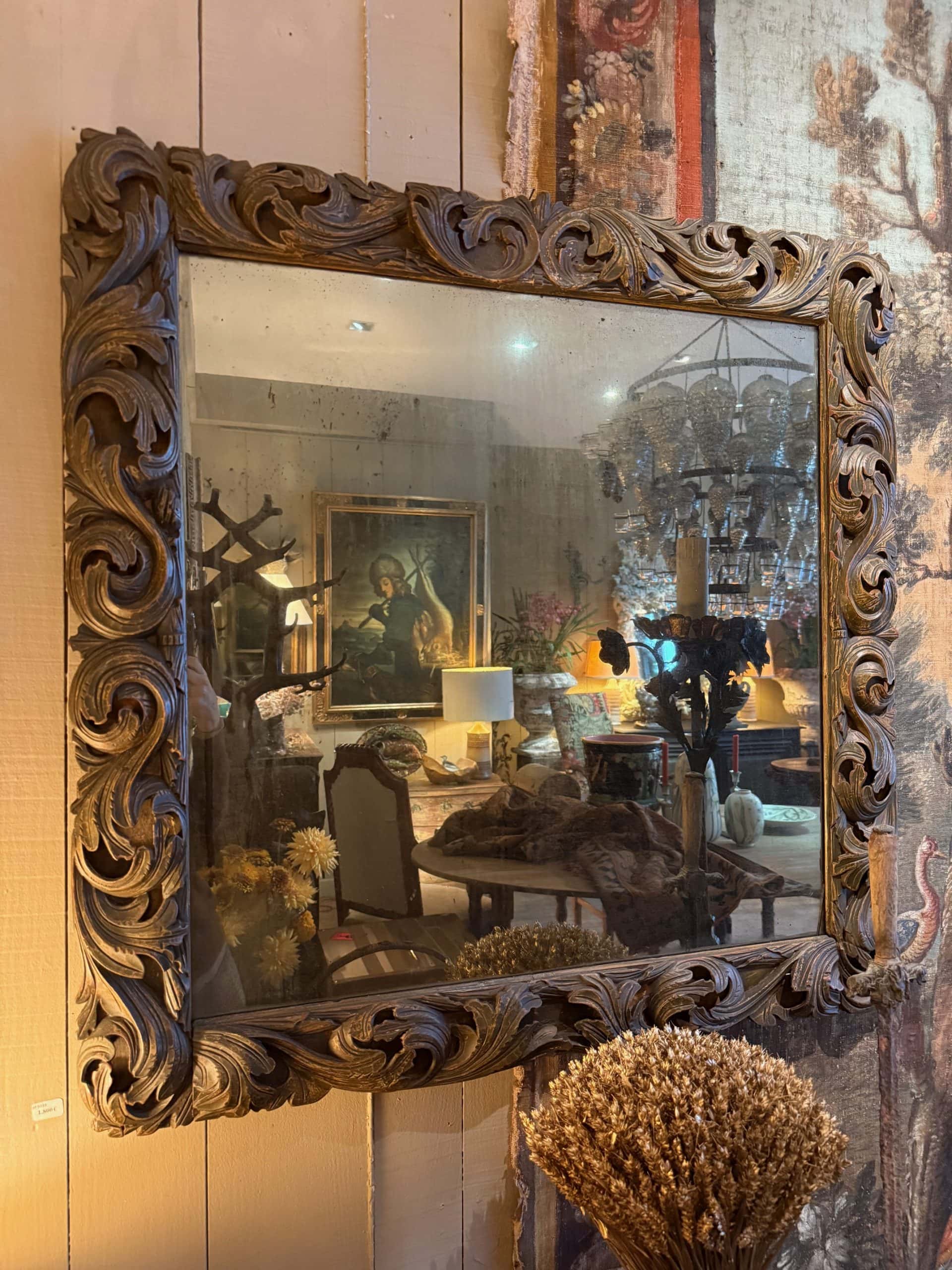 Miroir en bois sculpté motif de volutes et laque verte foncé – Italie XIXe