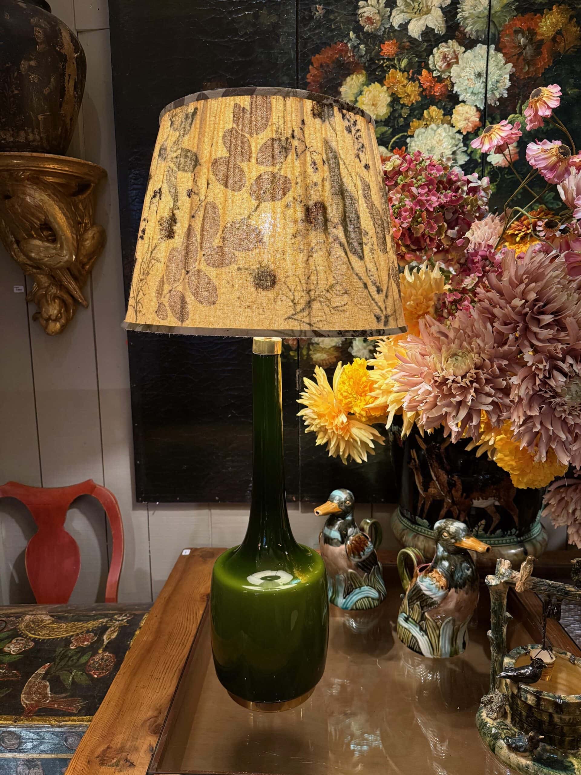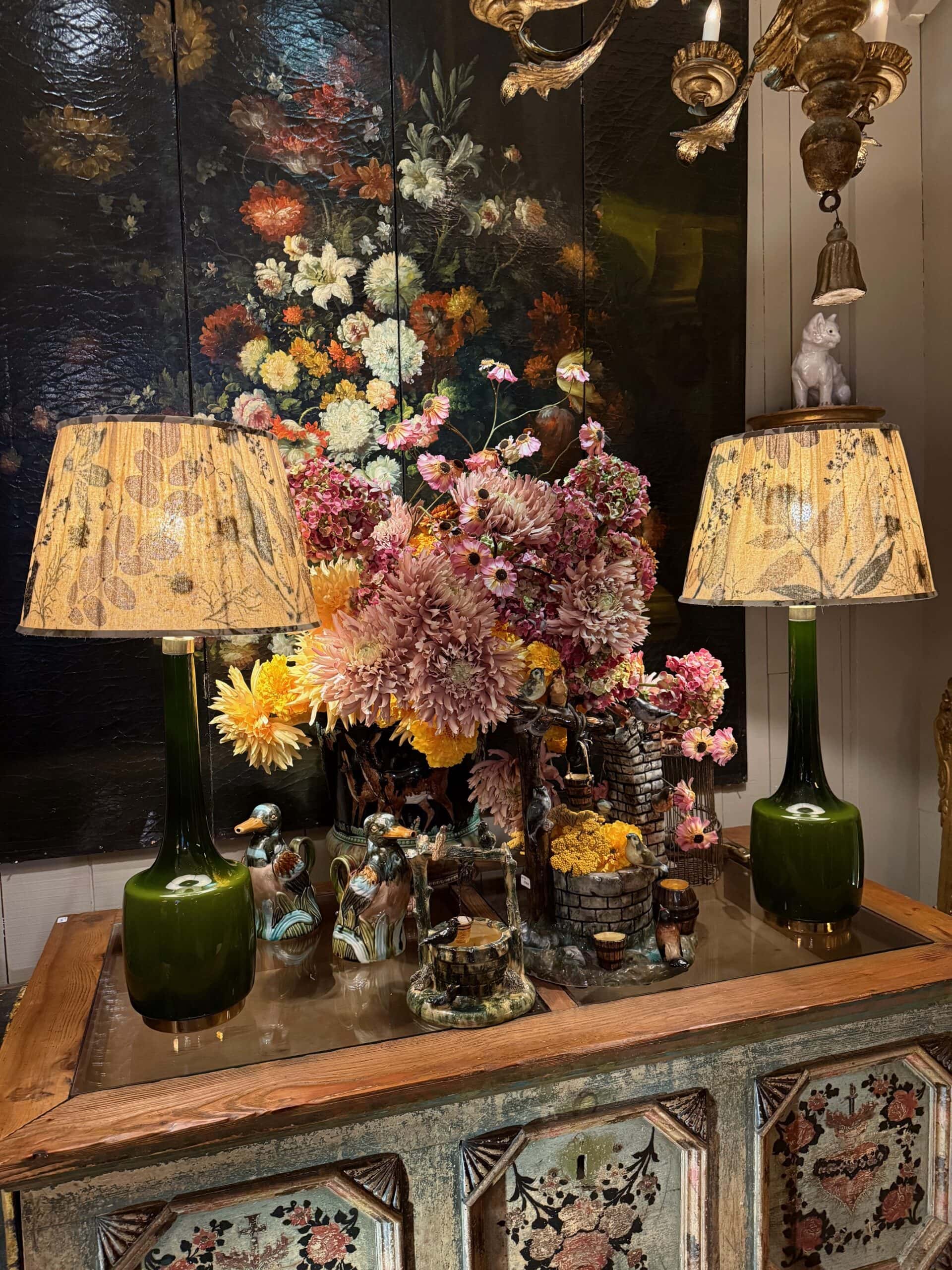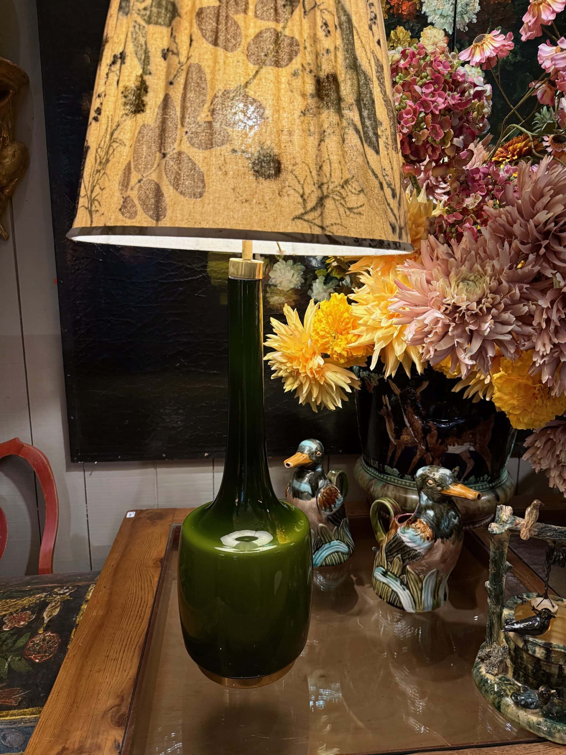 Paire de grandes lampes en verre Vert & base laiton + AJ fleurs