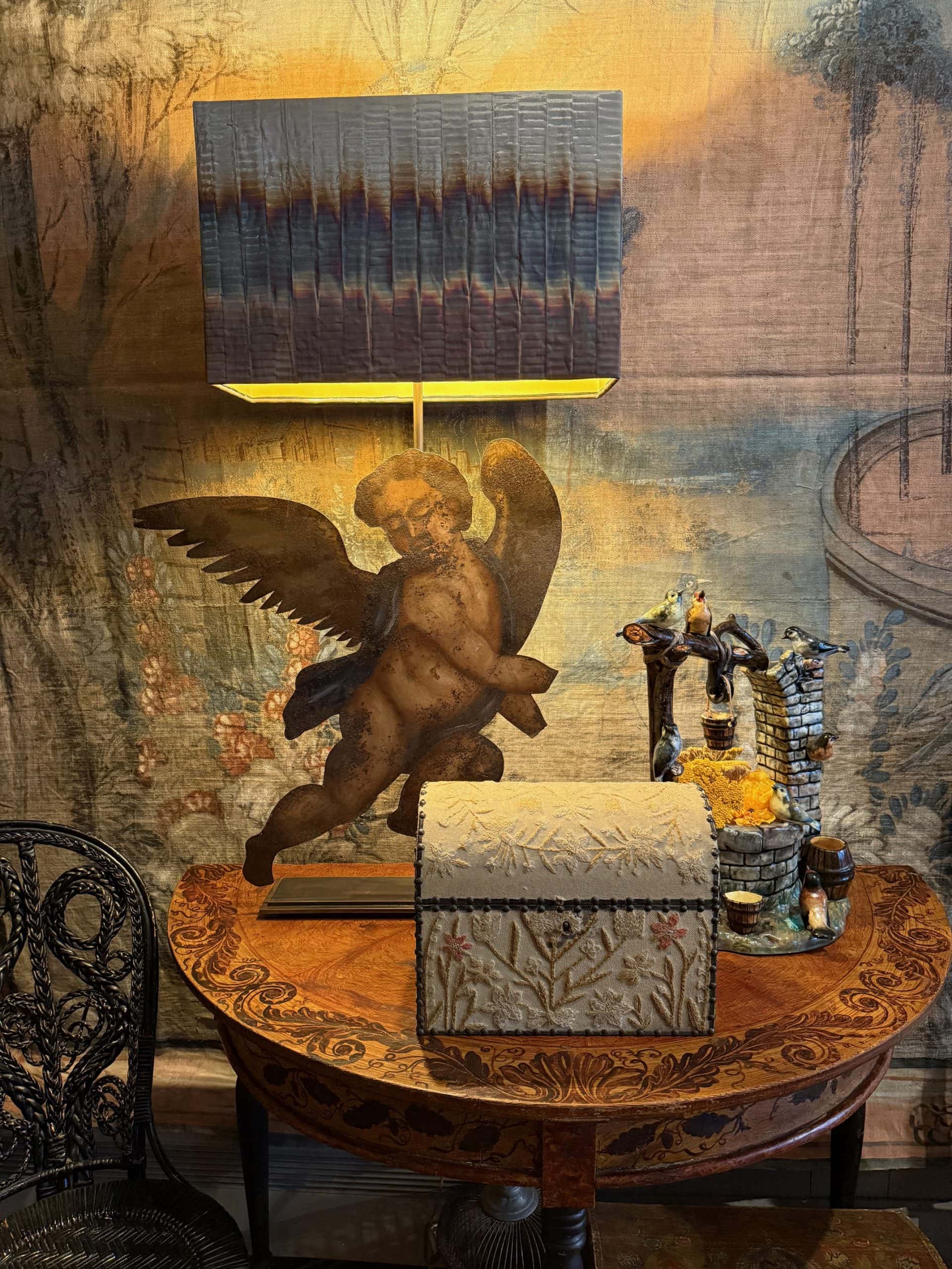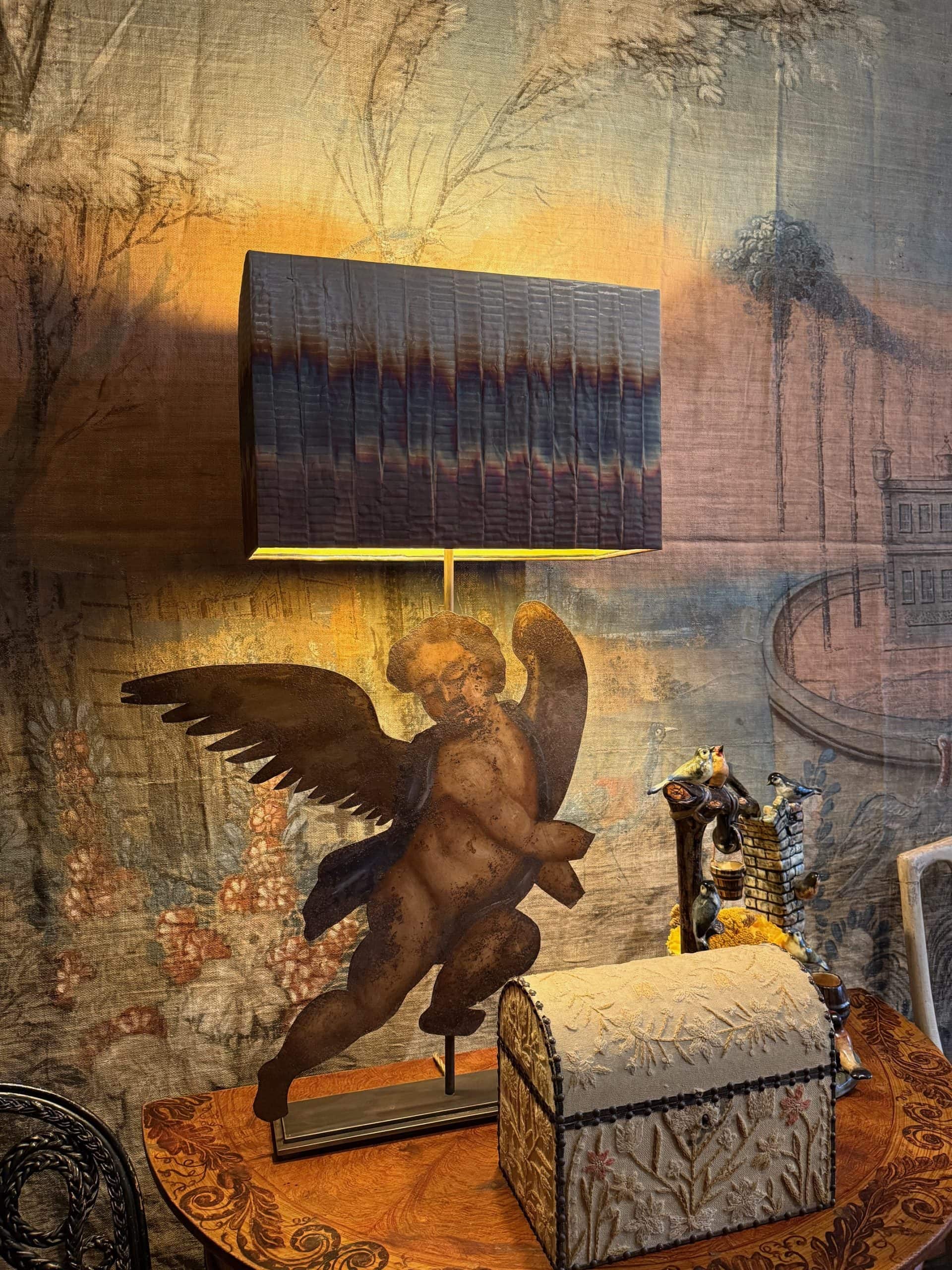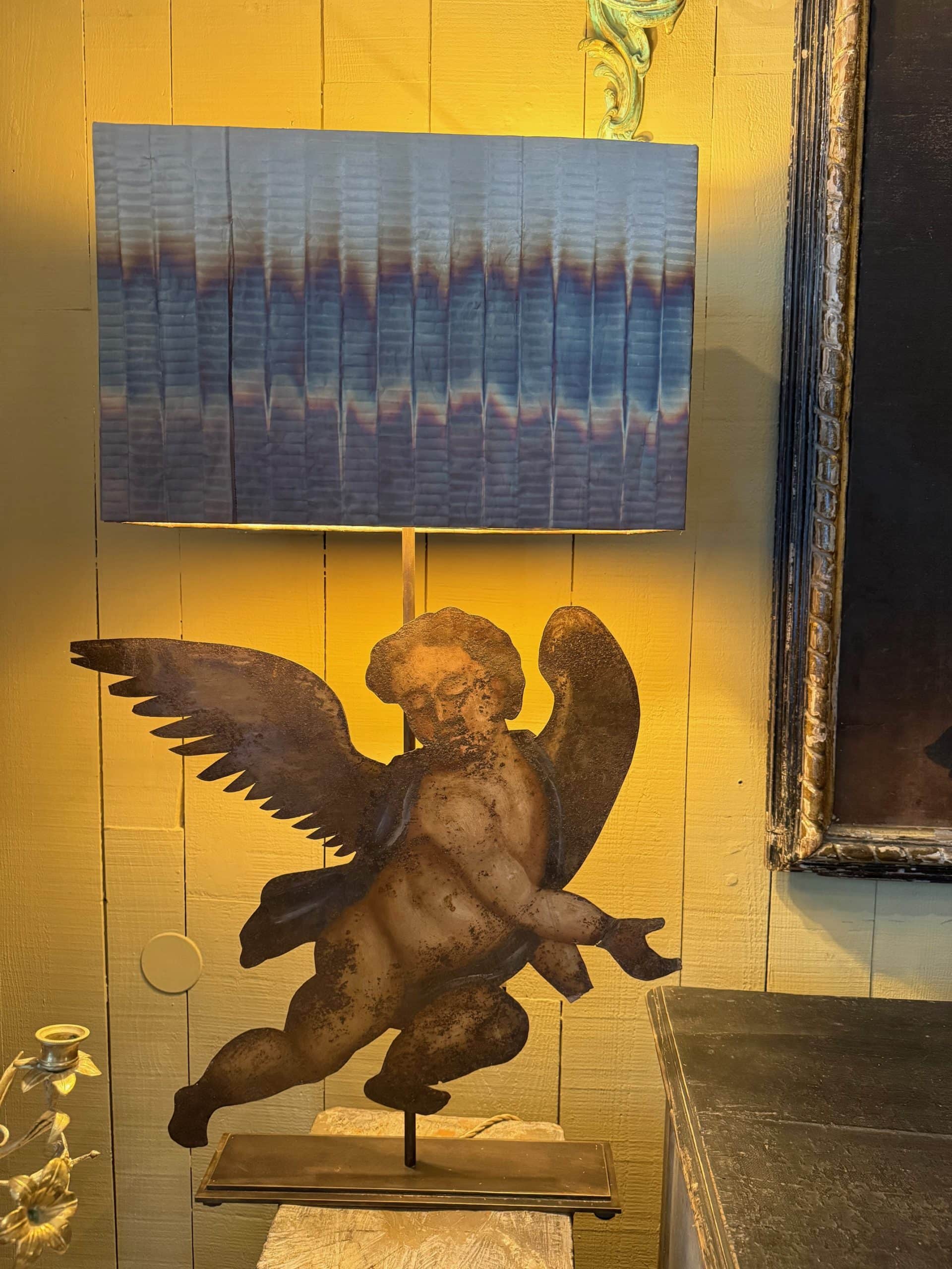 Paire de lampes “Angelots d’applique” montés sur socle & A/J tissu en fil de cuivre oxydé