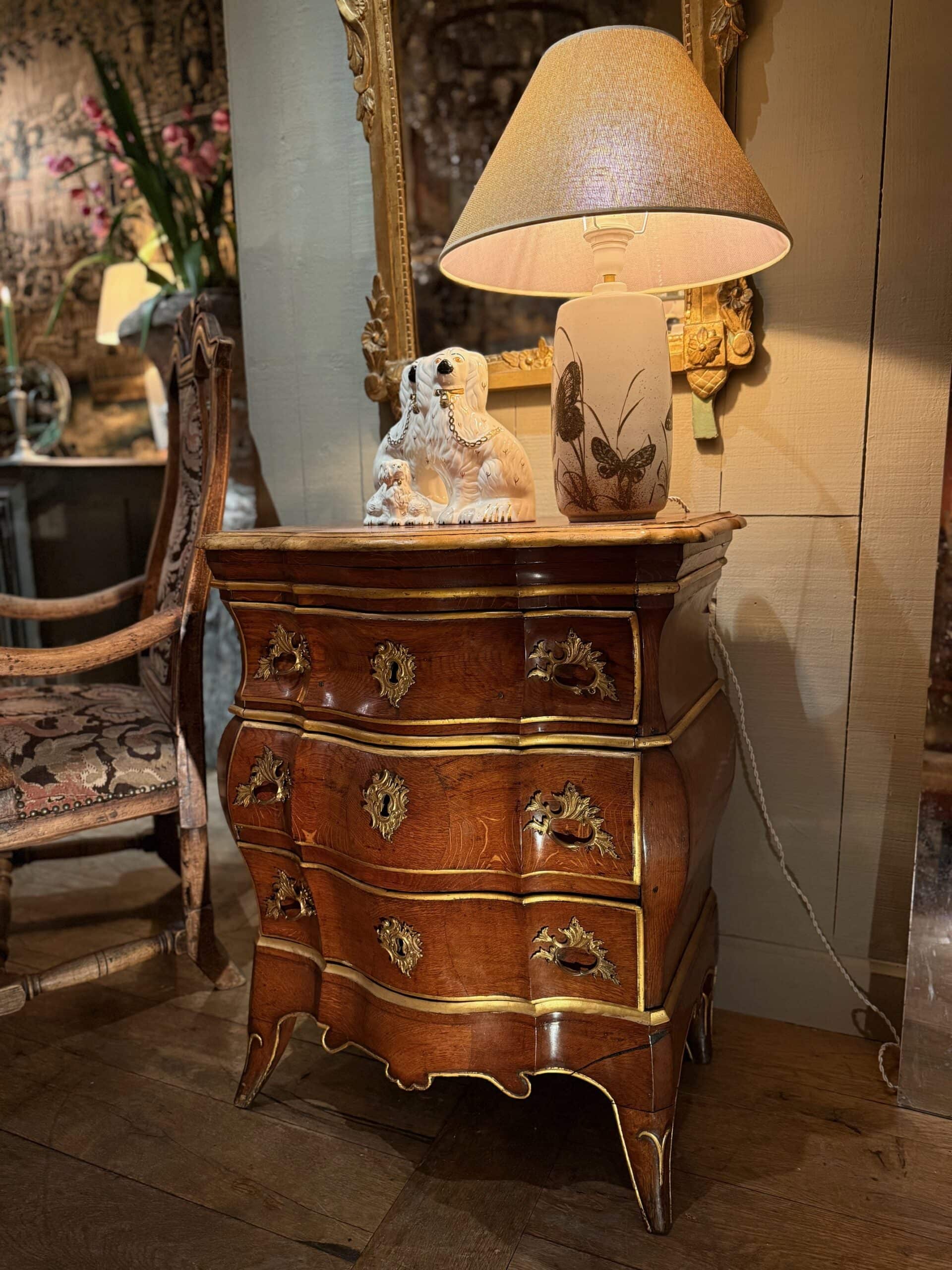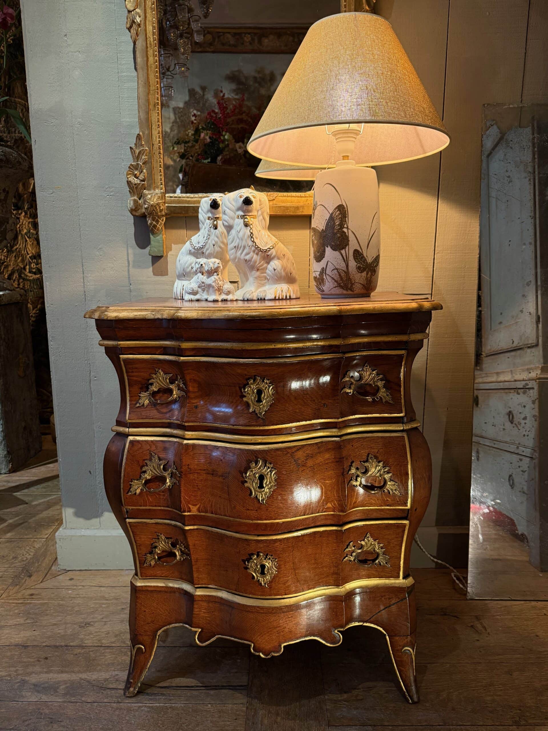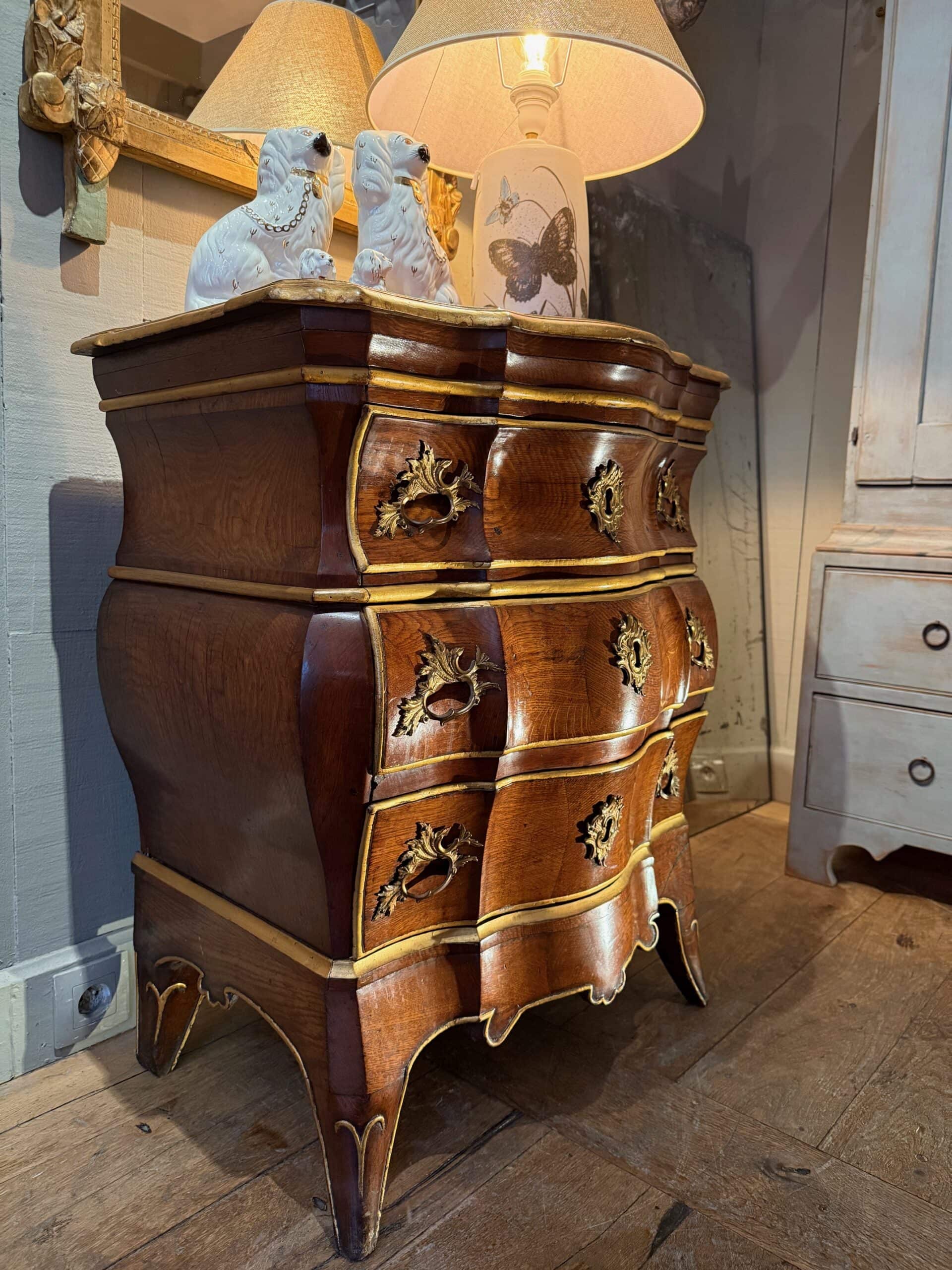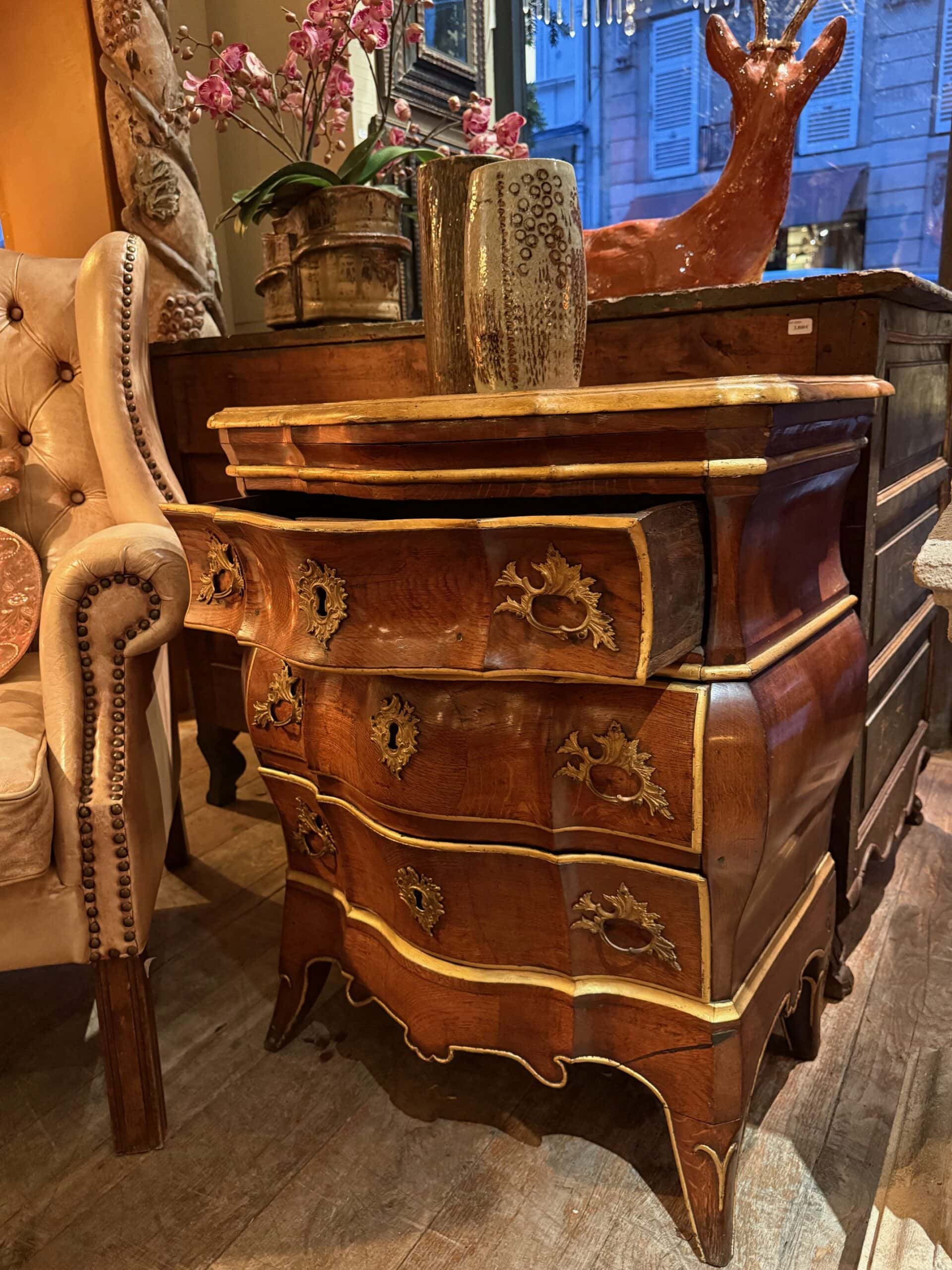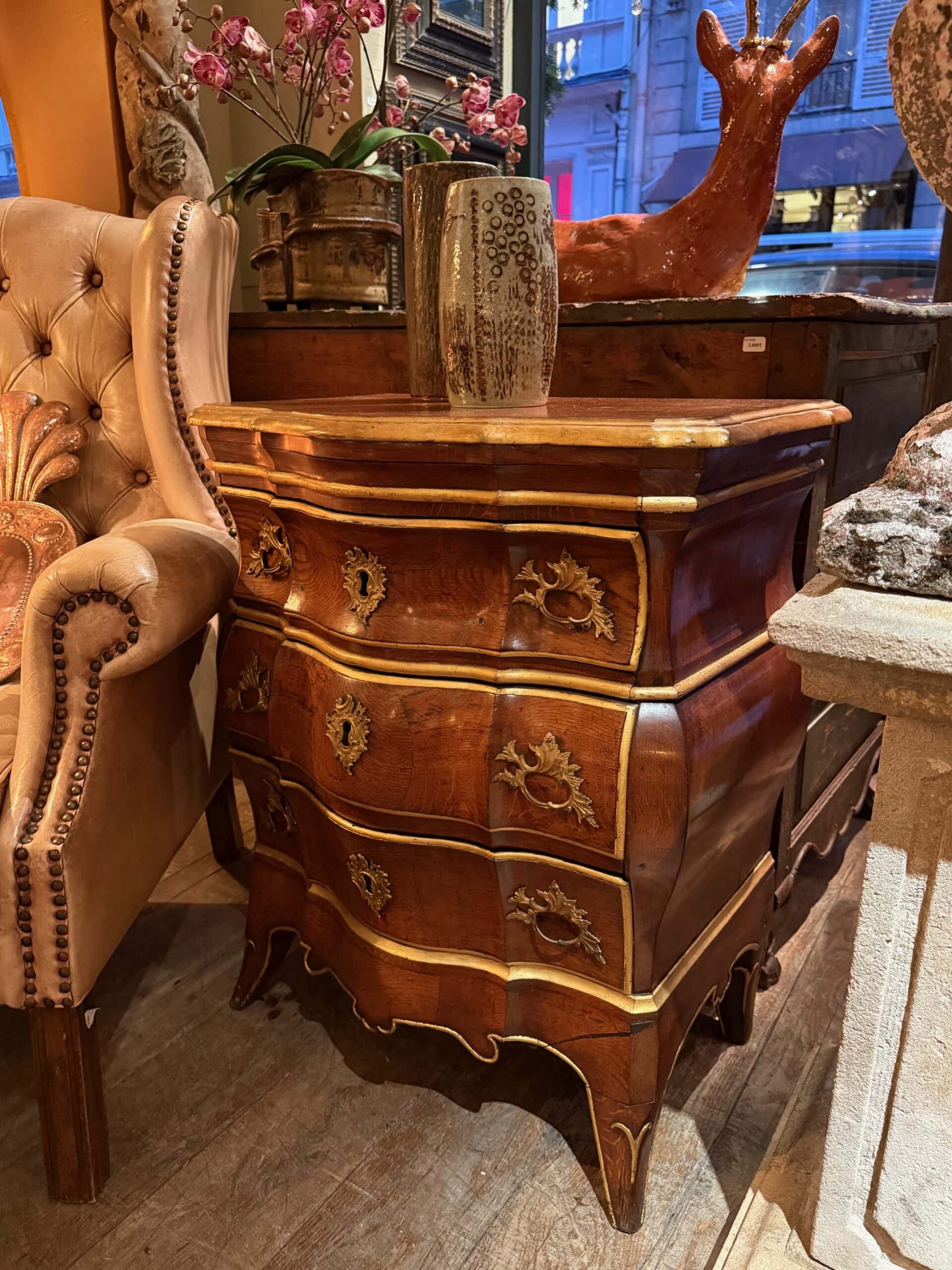 Petite commode baroque danoise en bois naturel réhaussé de feuille d’or ca.1750
