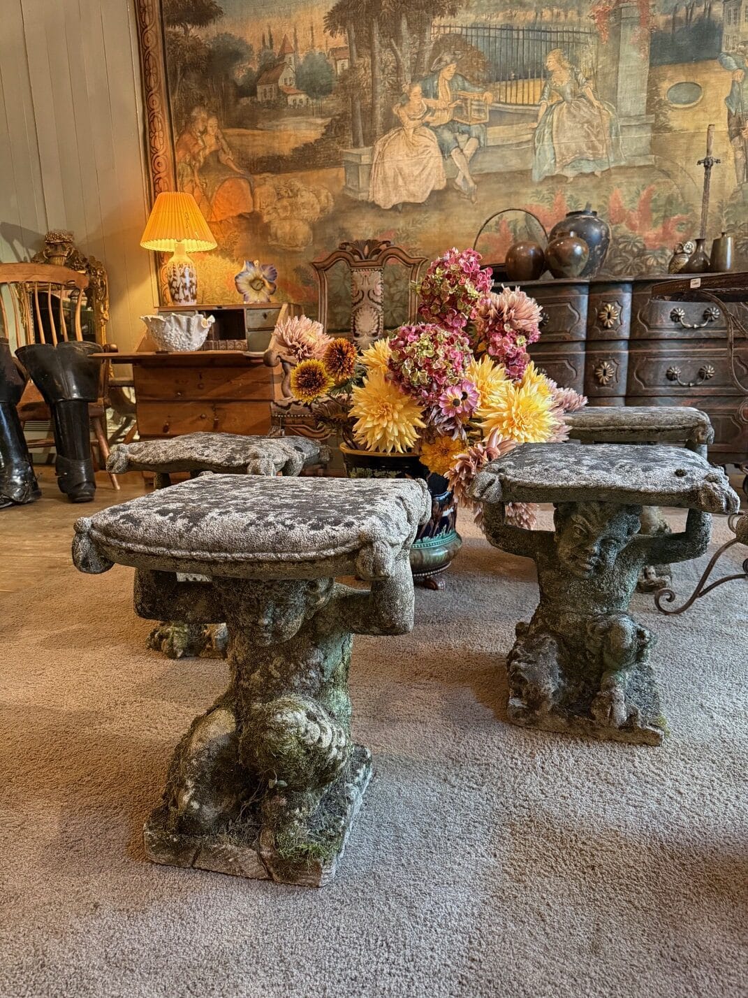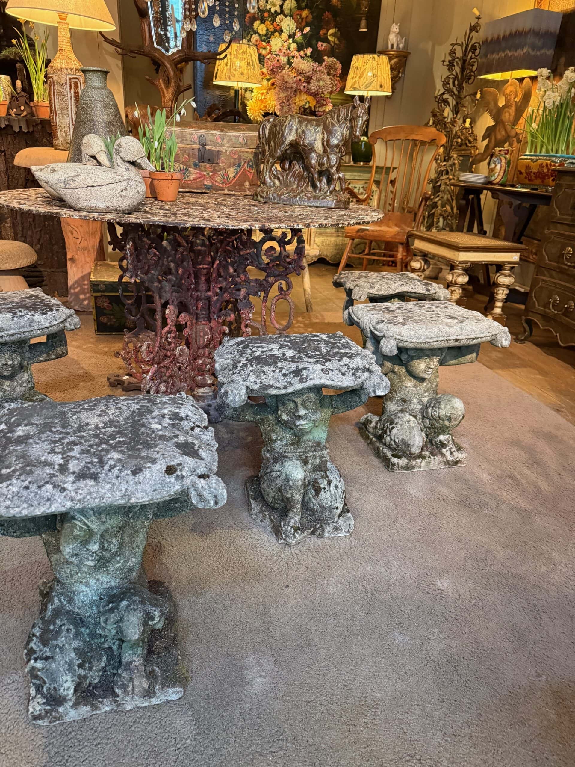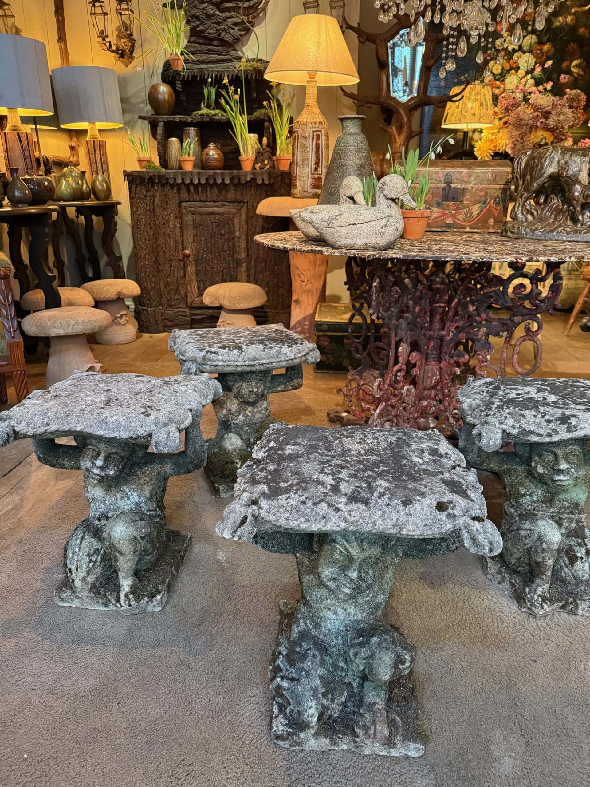 Rare suite de 6 tabourets “faunes” en pierre sculptée – Italie XIXe
