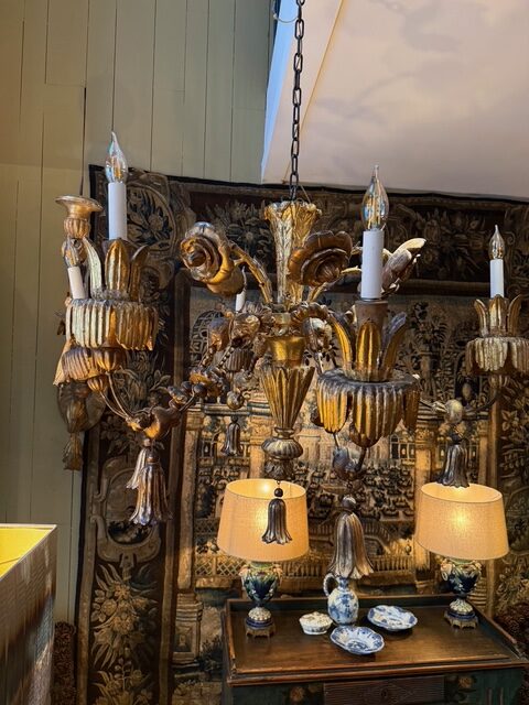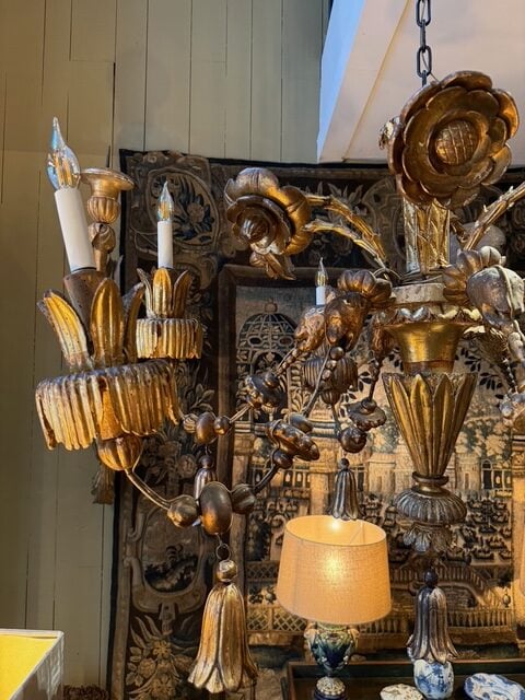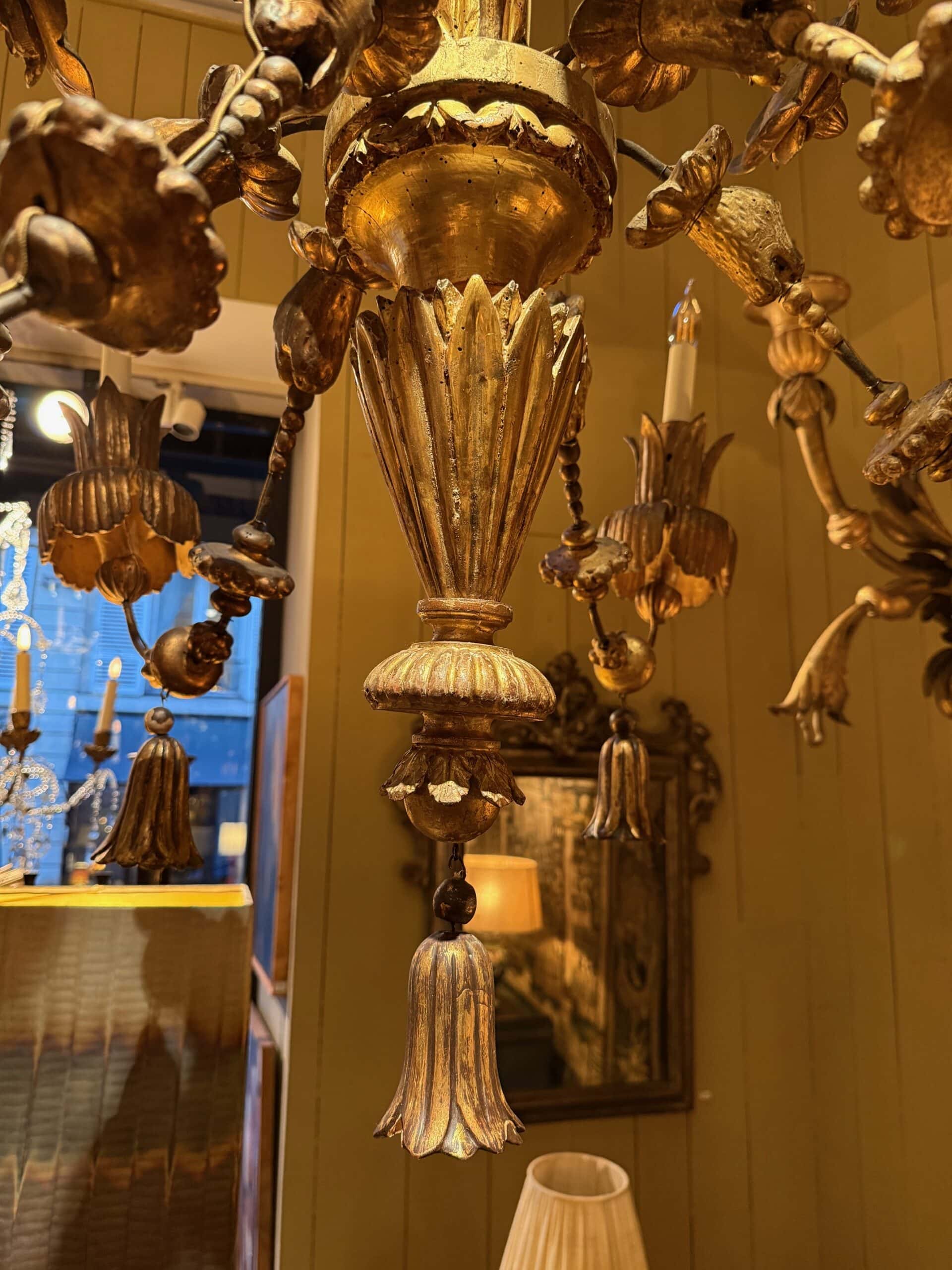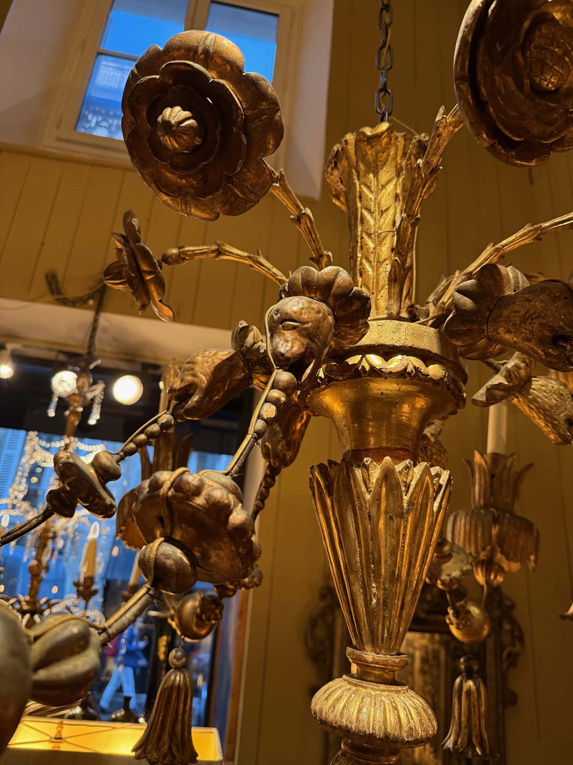 Très grand lustre en bois doré XVIIIe motifs Camélia & têtes de lion