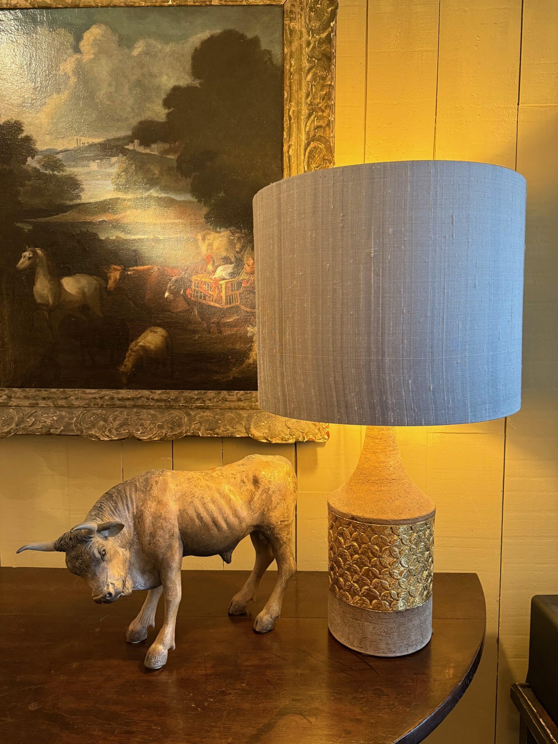 3. Une paire de lampes terre chamotée taupe & décor relief doré + AJ soie grise – par Bergboms ca.1960
