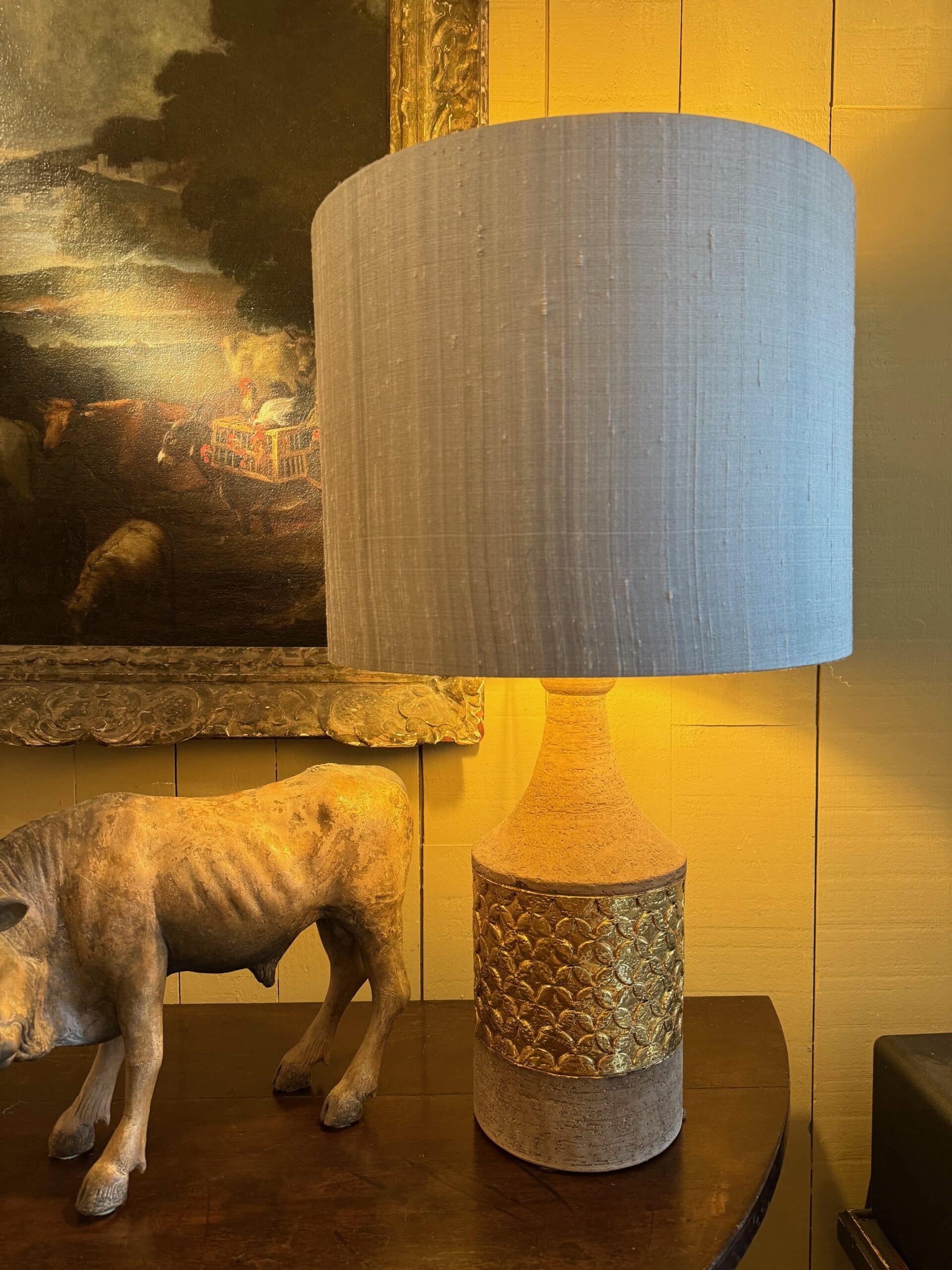 Une paire de lampes terre chamotée taupe & décor relief doré + AJ soie grise – par Bergboms ca.1960