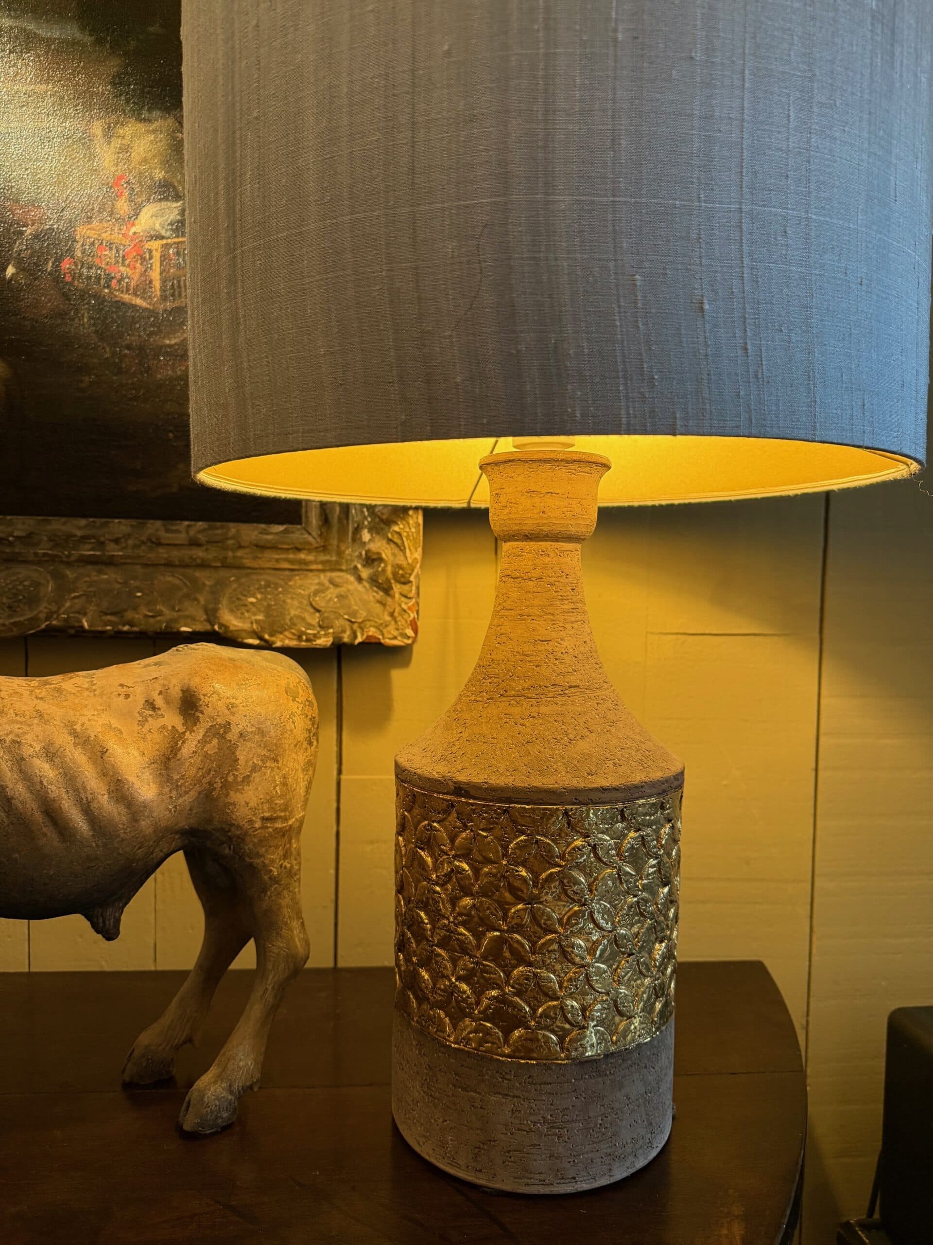 Une paire de lampes terre chamotée taupe & décor relief doré + AJ soie grise - par Bergboms ca.1960